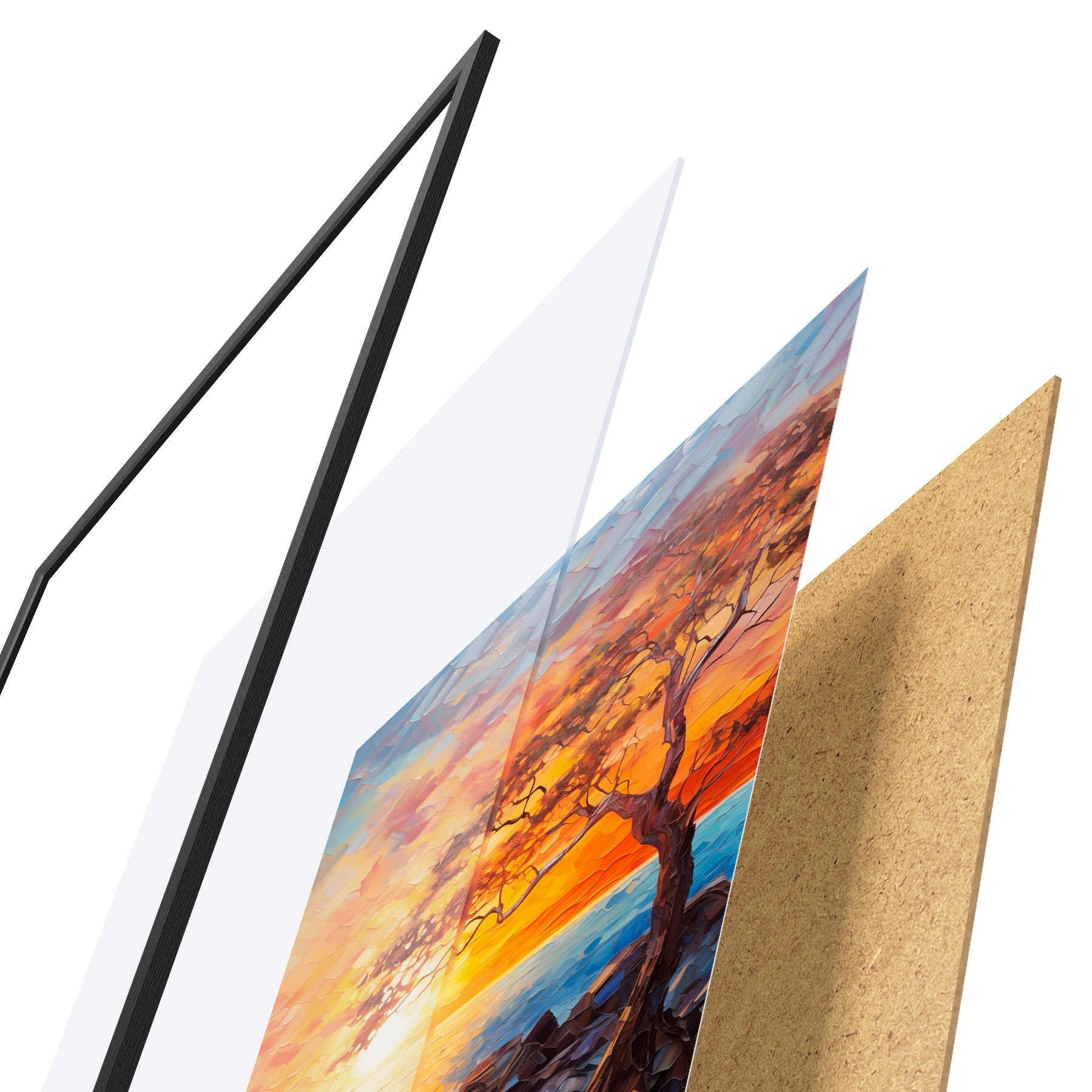 Das Poster besteht aus einem Rahmen, Plexiglas, einem gedruckten Bild und einer Rückwand aus Spanplatten. Dank der Halterungen auf der Rückseite kann das Poster sofort an die Wand gehängt werden.
