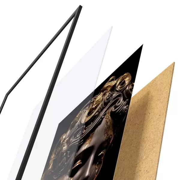 Das Poster besteht aus einem Rahmen, Plexiglas, einem gedruckten Bild und einer Rückwand aus Spanplatten. Dank der Halterungen auf der Rückseite kann das Poster sofort an die Wand gehängt werden.