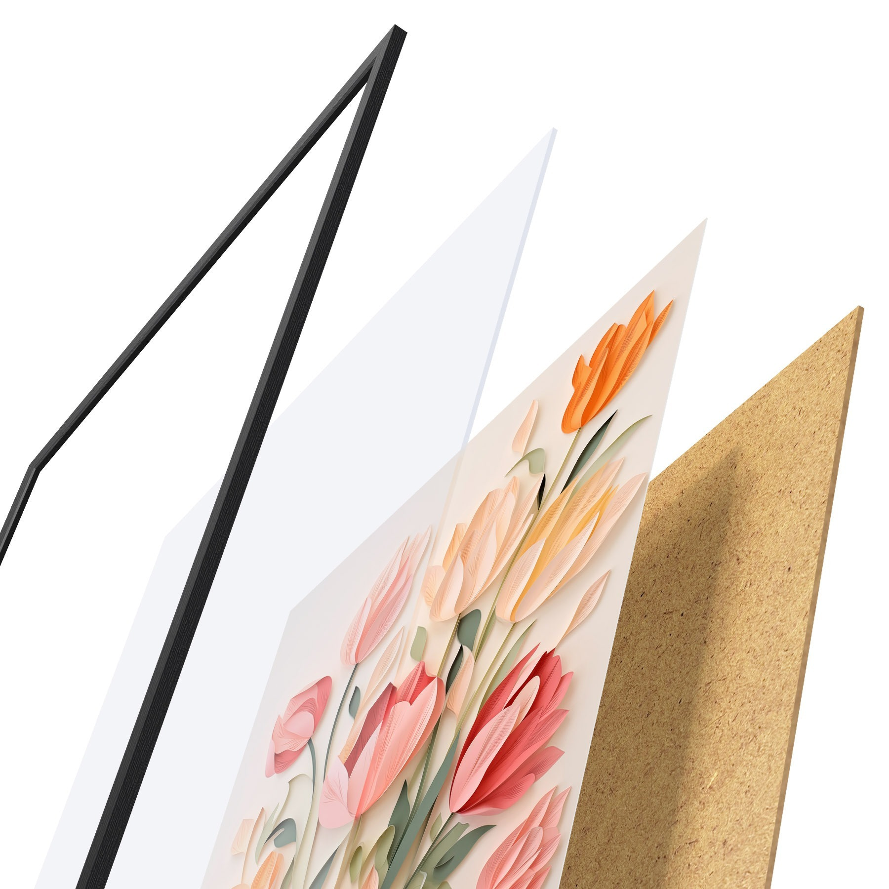 Das Poster besteht aus einem Rahmen, Plexiglas, einem gedruckten Bild und einer Rückwand aus Spanplatten. Dank der Halterungen auf der Rückseite kann das Poster sofort an die Wand gehängt werden.