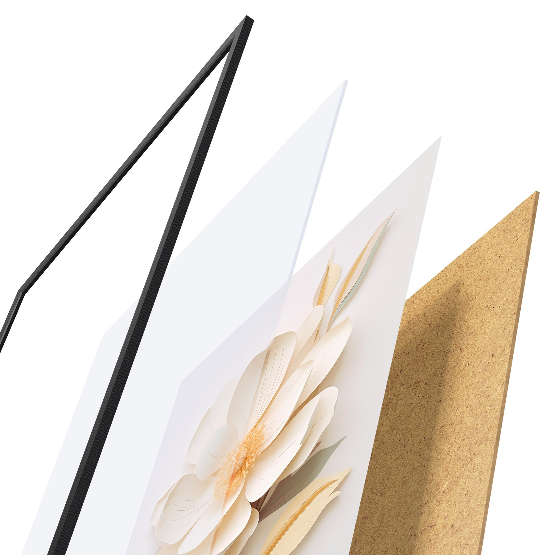 Das Poster besteht aus einem Rahmen, Plexiglas, einem gedruckten Bild und einer Rückwand aus Spanplatten. Dank der Halterungen auf der Rückseite kann das Poster sofort an die Wand gehängt werden.