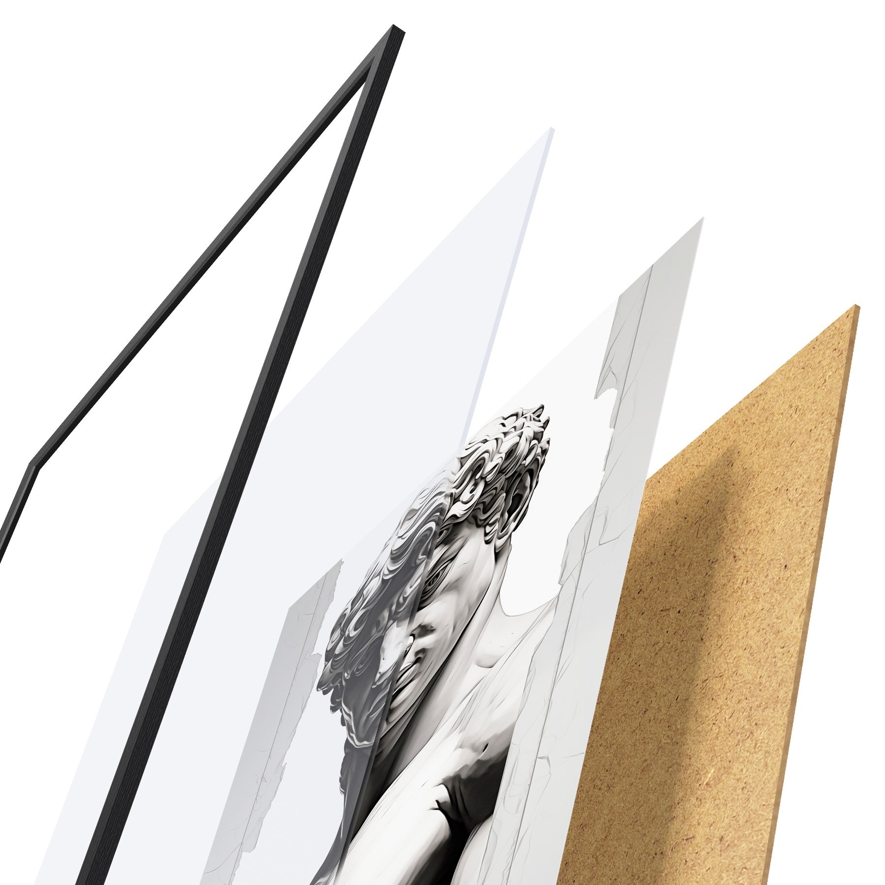 Das Poster besteht aus einem Rahmen, Plexiglas, einem gedruckten Bild und einer Rückwand aus Spanplatten. Dank der Halterungen auf der Rückseite kann das Poster sofort an die Wand gehängt werden.