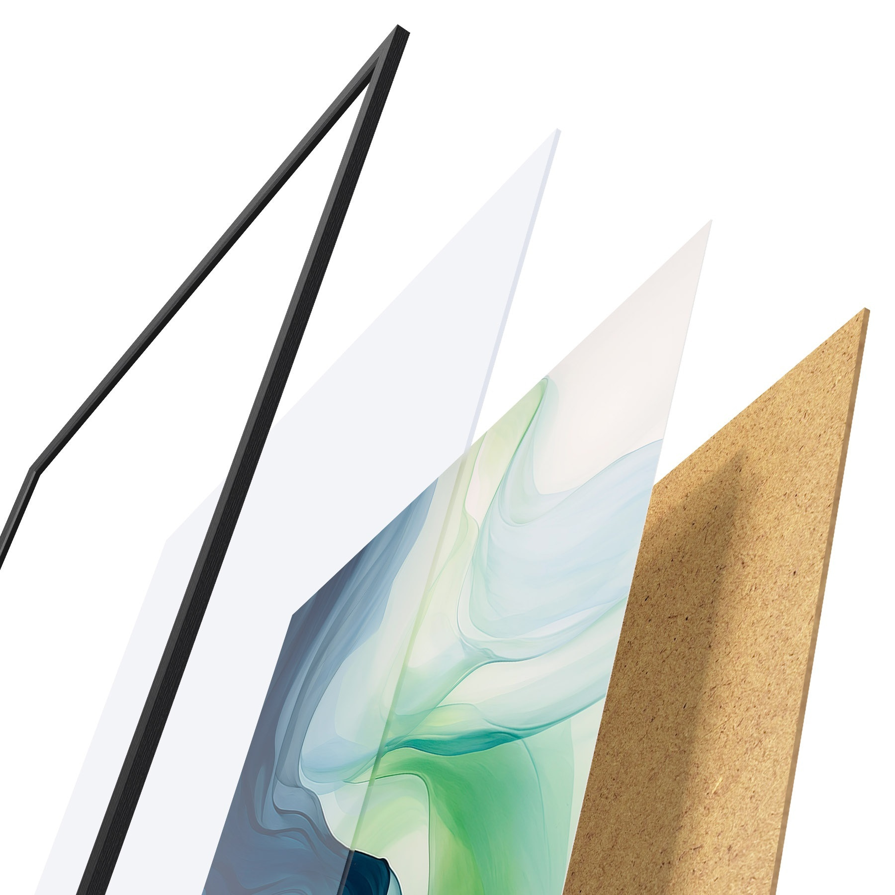 Das Poster besteht aus einem Rahmen, Plexiglas, einem gedruckten Bild und einer Rückwand aus Spanplatten. Dank der Halterungen auf der Rückseite kann das Poster sofort an die Wand gehängt werden.