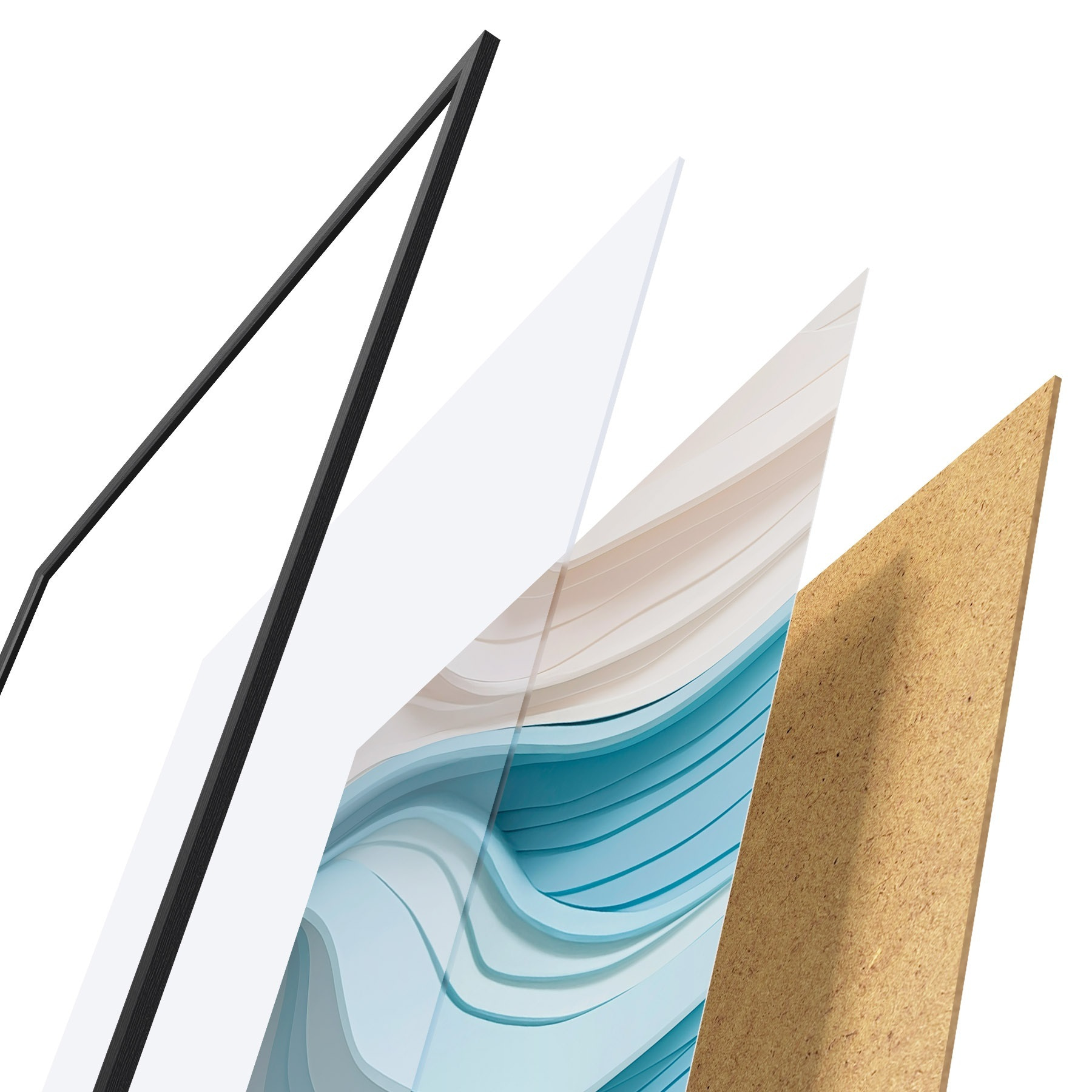 Das Poster besteht aus einem Rahmen, Plexiglas, einem gedruckten Bild und einer Rückwand aus Spanplatten. Dank der Halterungen auf der Rückseite kann das Poster sofort an die Wand gehängt werden.
