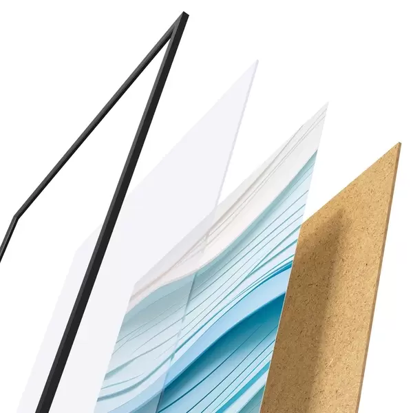 Das Poster besteht aus einem Rahmen, Plexiglas, einem gedruckten Bild und einer Rückwand aus Spanplatten. Dank der Halterungen auf der Rückseite kann das Poster sofort an die Wand gehängt werden.