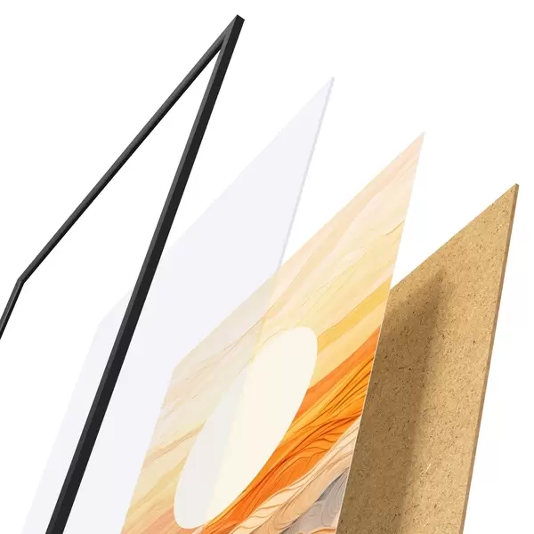 Das Poster besteht aus einem Rahmen, Plexiglas, einem gedruckten Bild und einer Rückwand aus Spanplatten. Dank der Halterungen auf der Rückseite kann das Poster sofort an die Wand gehängt werden.