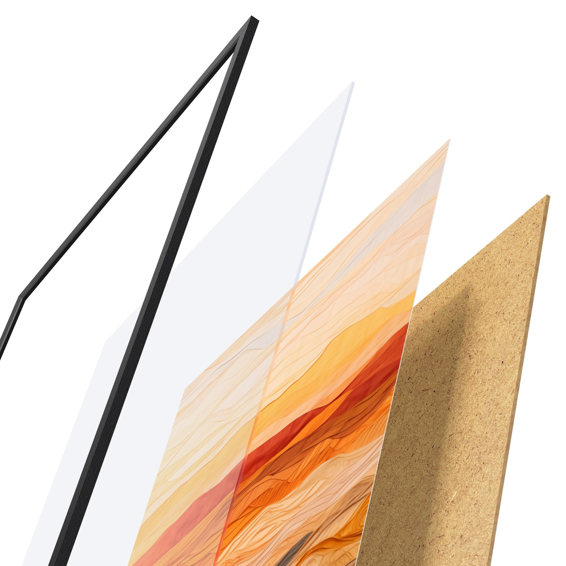 Das Poster besteht aus einem Rahmen, Plexiglas, einem gedruckten Bild und einer Rückwand aus Spanplatten. Dank der Halterungen auf der Rückseite kann das Poster sofort an die Wand gehängt werden.