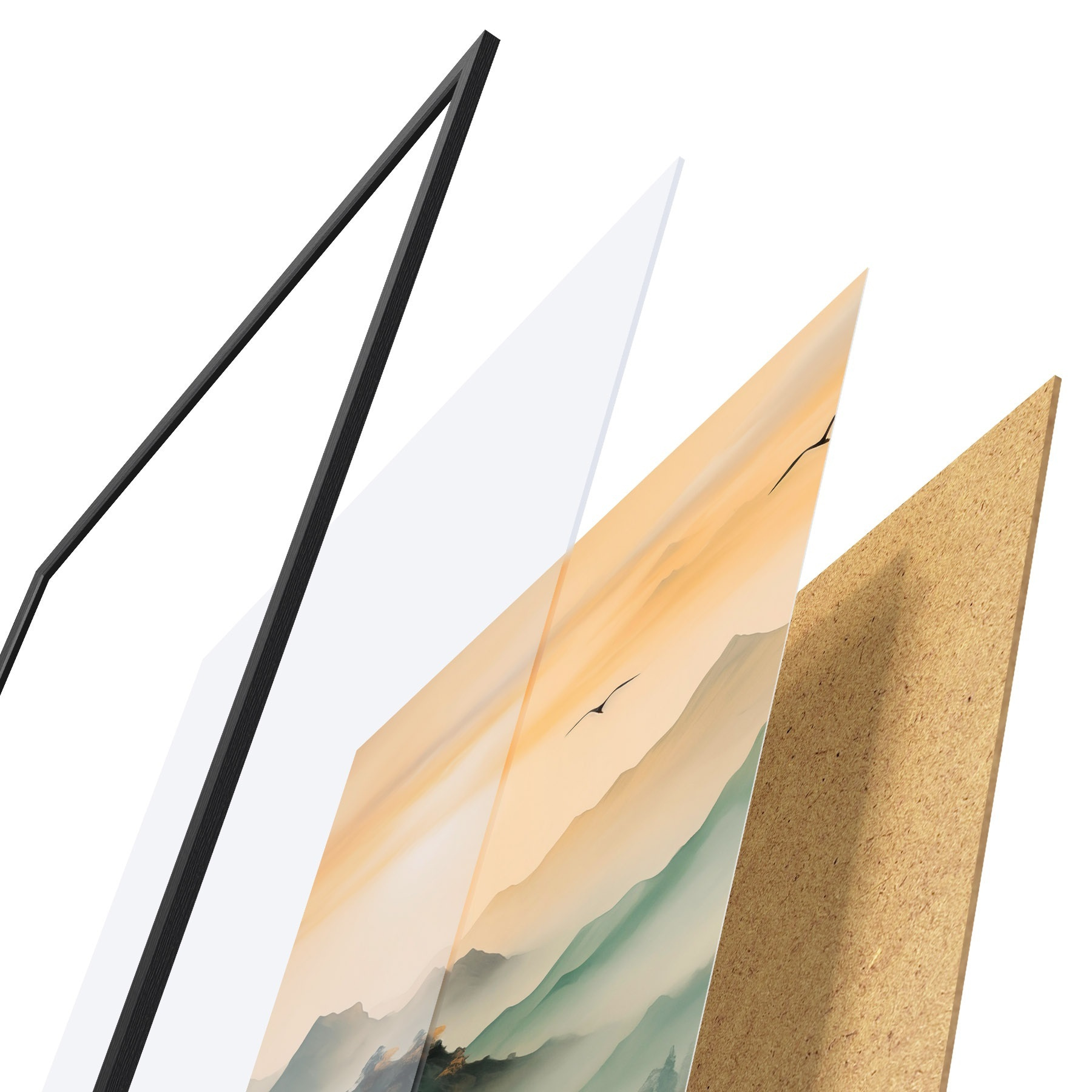 Das Poster besteht aus einem Rahmen, Plexiglas, einem gedruckten Bild und einer Rückwand aus Spanplatten. Dank der Halterungen auf der Rückseite kann das Poster sofort an die Wand gehängt werden.