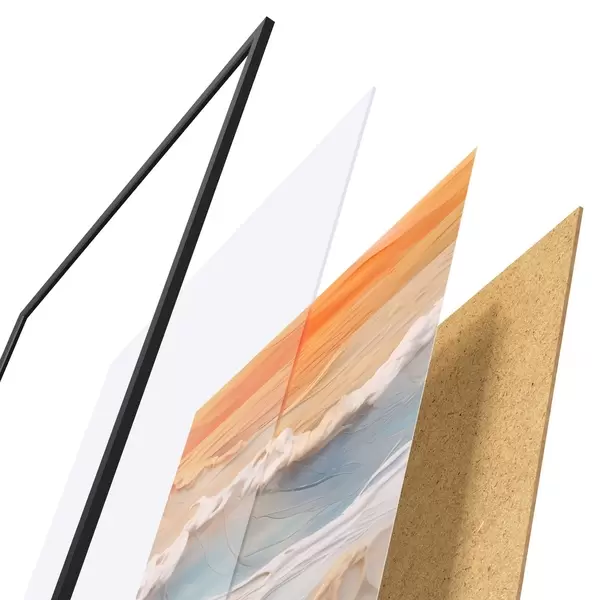 Das Poster besteht aus einem Rahmen, Plexiglas, einem gedruckten Bild und einer Rückwand aus Spanplatten. Dank der Halterungen auf der Rückseite kann das Poster sofort an die Wand gehängt werden.