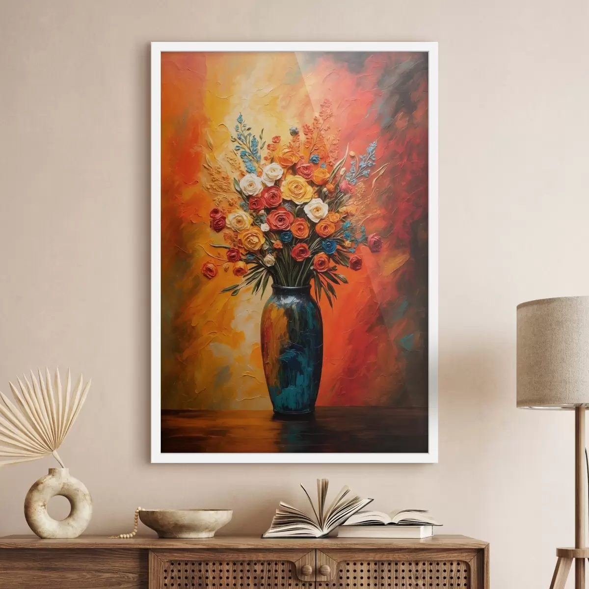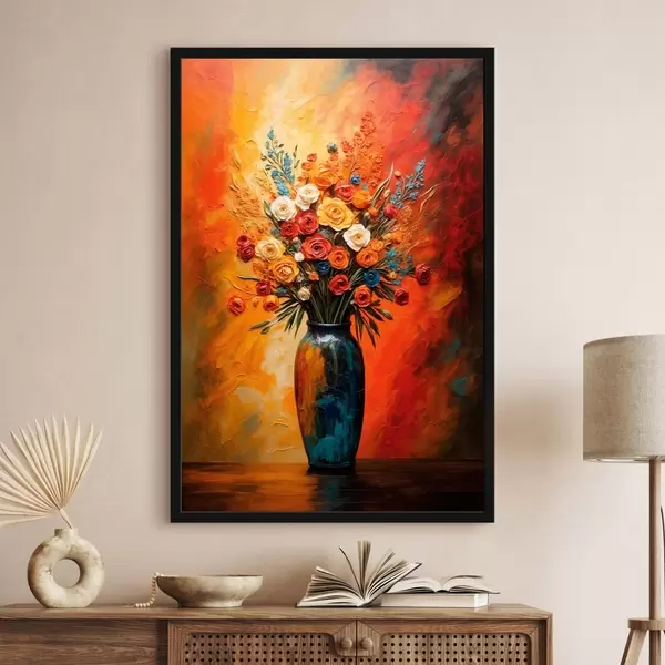 Poster Verschiedene Blumen in Vase auf rot-gelbem Hintergrund f43867