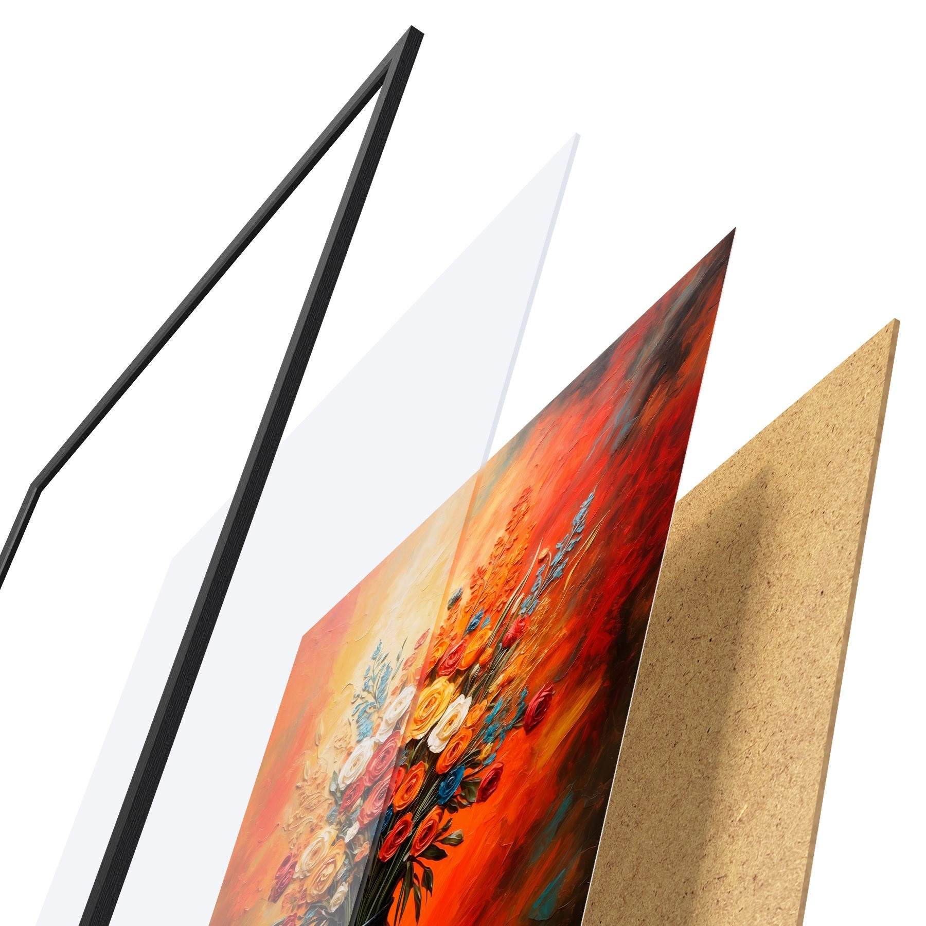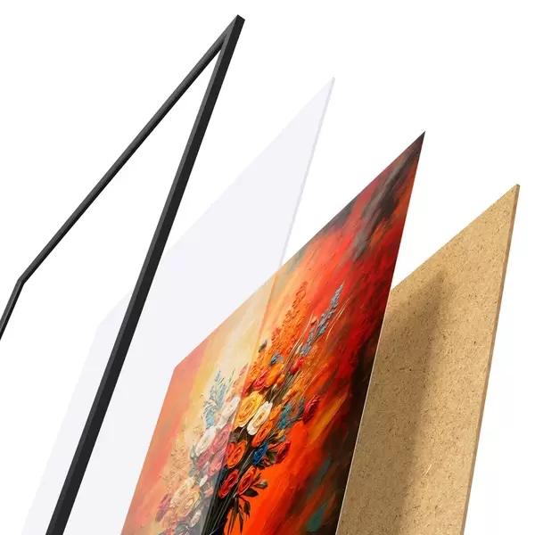 Das Poster besteht aus einem Rahmen, Plexiglas, einem gedruckten Bild und einer Rückwand aus Spanplatten. Dank der Halterungen auf der Rückseite kann das Poster sofort an die Wand gehängt werden.