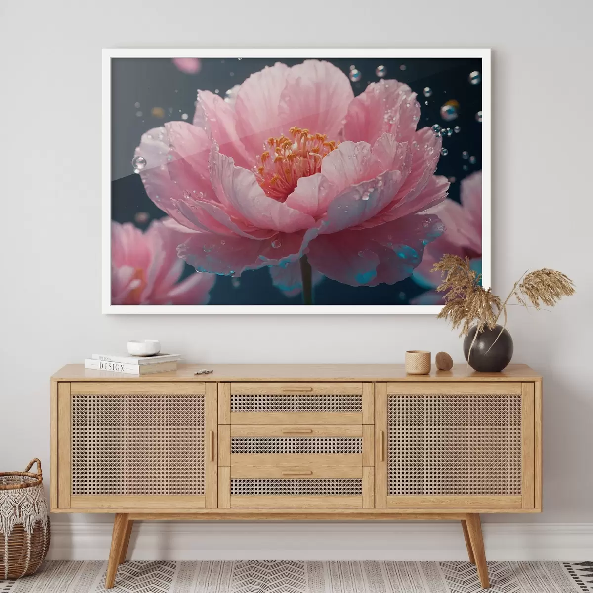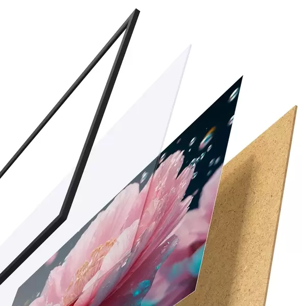Das Poster besteht aus einem Rahmen, Plexiglas, einem gedruckten Bild und einer Rückwand aus Spanplatten. Dank der Halterungen auf der Rückseite kann das Poster sofort an die Wand gehängt werden.