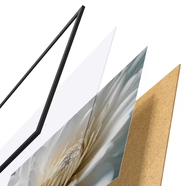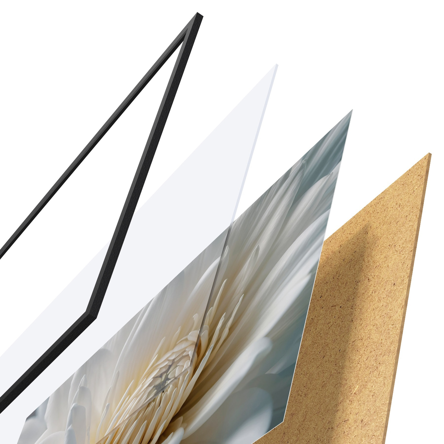 Das Poster besteht aus einem Rahmen, Plexiglas, einem gedruckten Bild und einer Rückwand aus Spanplatten. Dank der Halterungen auf der Rückseite kann das Poster sofort an die Wand gehängt werden.
