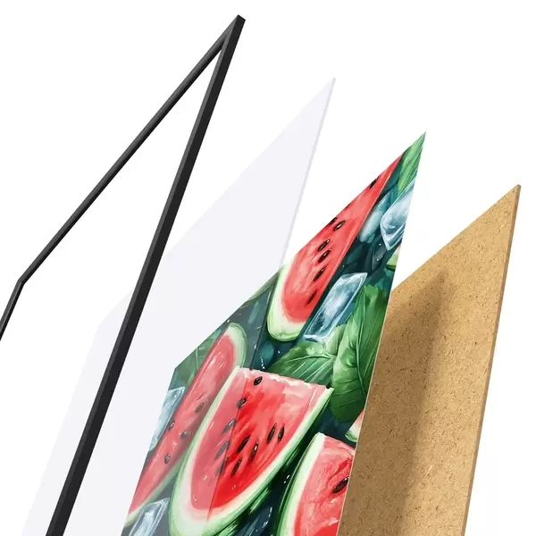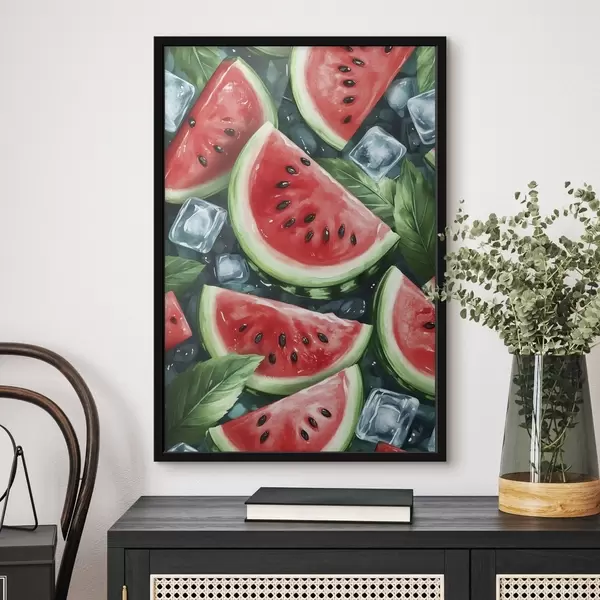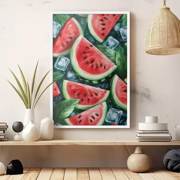 Poster Wassermelonenscheiben mit Eiswürfeln und Minze, Aquarellstil f43880