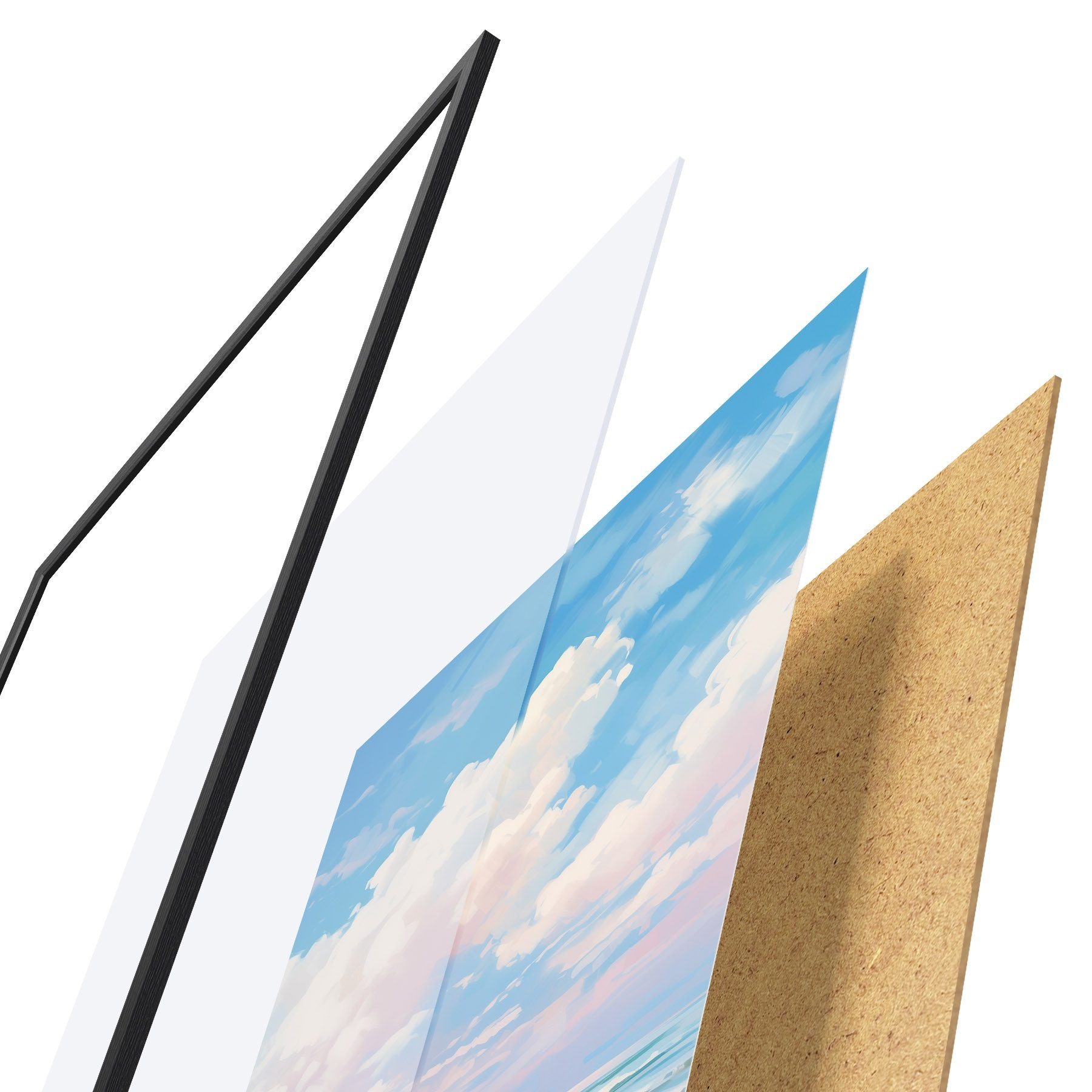 Das Poster besteht aus einem Rahmen, Plexiglas, einem gedruckten Bild und einer Rückwand aus Spanplatten. Dank der Halterungen auf der Rückseite kann das Poster sofort an die Wand gehängt werden.