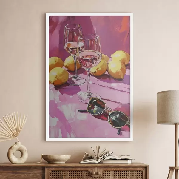 Poster Abstraktion im Ölstil mit Getränkegläsern, Zitronen und Sonnenbrille Nr f43884