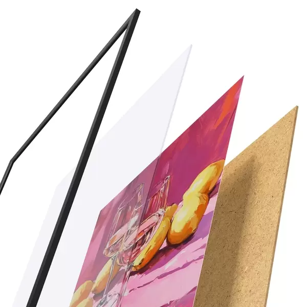 Das Poster besteht aus einem Rahmen, Plexiglas, einem gedruckten Bild und einer Rückwand aus Spanplatten. Dank der Halterungen auf der Rückseite kann das Poster sofort an die Wand gehängt werden.