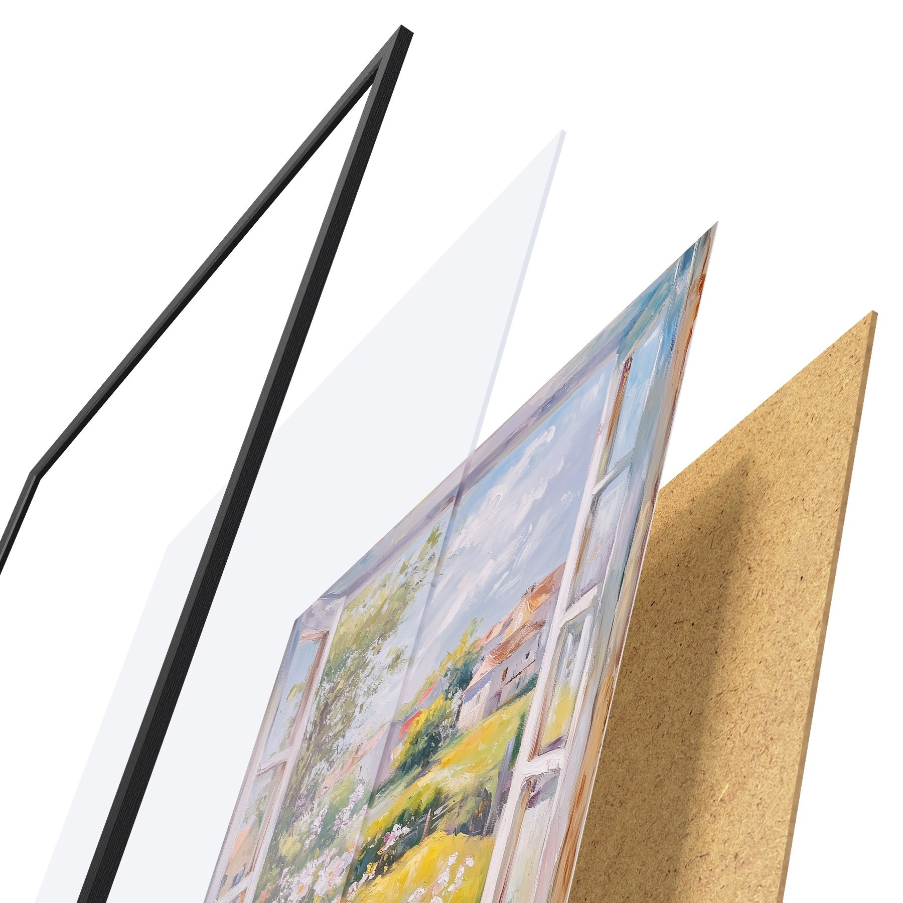 Das Poster besteht aus einem Rahmen, Plexiglas, einem gedruckten Bild und einer Rückwand aus Spanplatten. Dank der Halterungen auf der Rückseite kann das Poster sofort an die Wand gehängt werden.