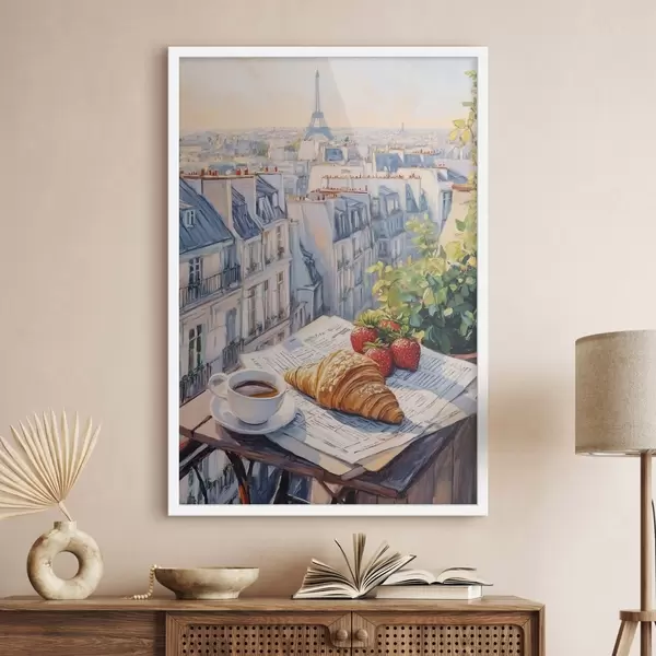 Poster Sonnenaufgang auf dem Balkon in Paris, Eiffelturm, Erdbeeren, Kaffee, Tagebuch Nr f43890