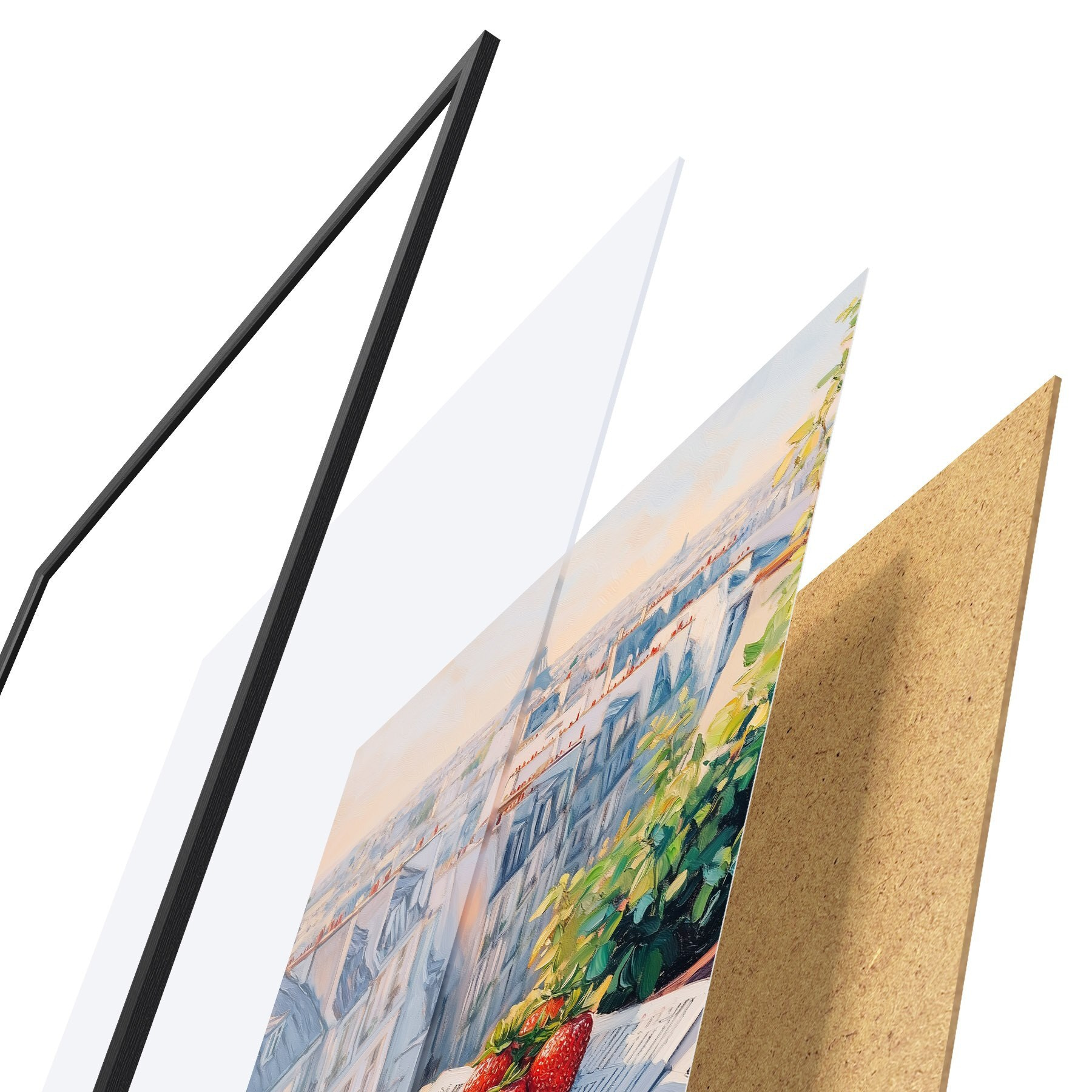 Das Poster besteht aus einem Rahmen, Plexiglas, einem gedruckten Bild und einer Rückwand aus Spanplatten. Dank der Halterungen auf der Rückseite kann das Poster sofort an die Wand gehängt werden.