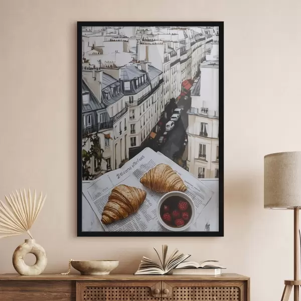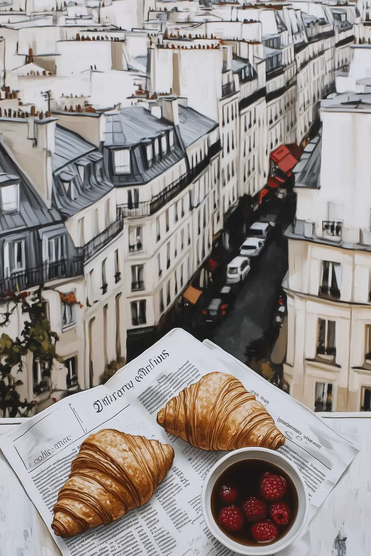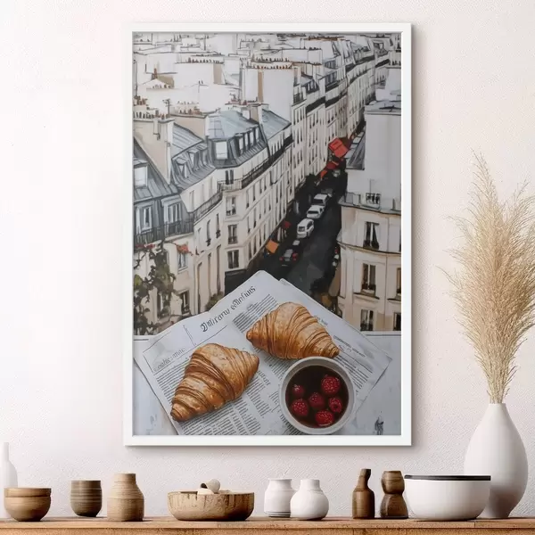 Poster Morgenkaffee mit Croissants, Stadtstraße, architektonisch, Öl-Stil f43891