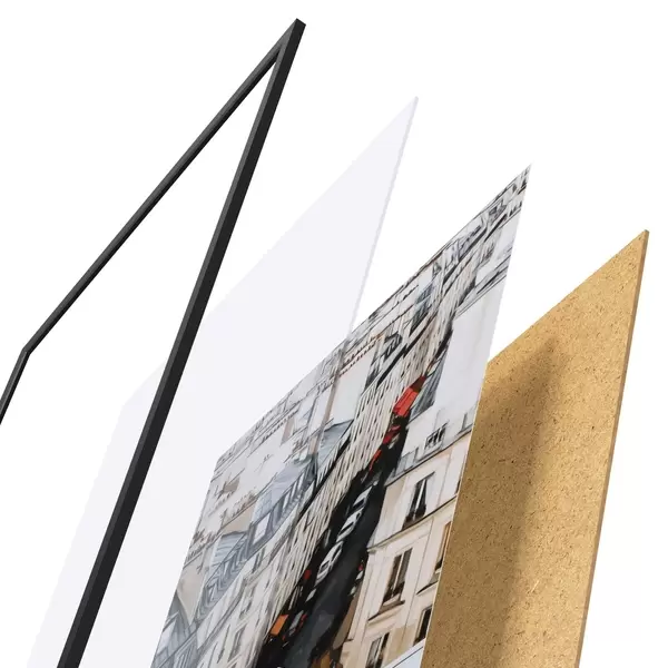 Das Poster besteht aus einem Rahmen, Plexiglas, einem gedruckten Bild und einer Rückwand aus Spanplatten. Dank der Halterungen auf der Rückseite kann das Poster sofort an die Wand gehängt werden.