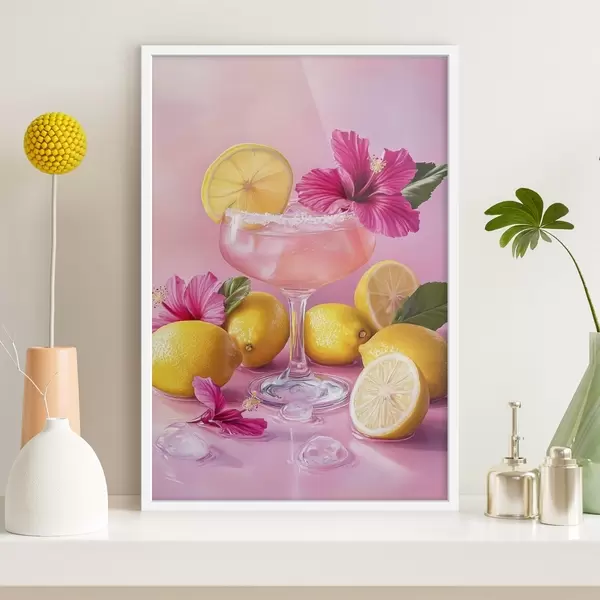 Poster Sommercocktail mit Blumen und Zitronen, rosa Farben, Aquarellstil Nr f43895