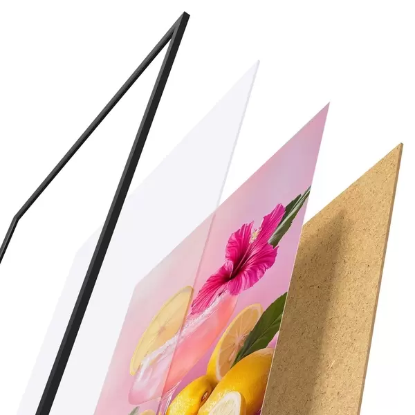 Das Poster besteht aus einem Rahmen, Plexiglas, einem gedruckten Bild und einer Rückwand aus Spanplatten. Dank der Halterungen auf der Rückseite kann das Poster sofort an die Wand gehängt werden.