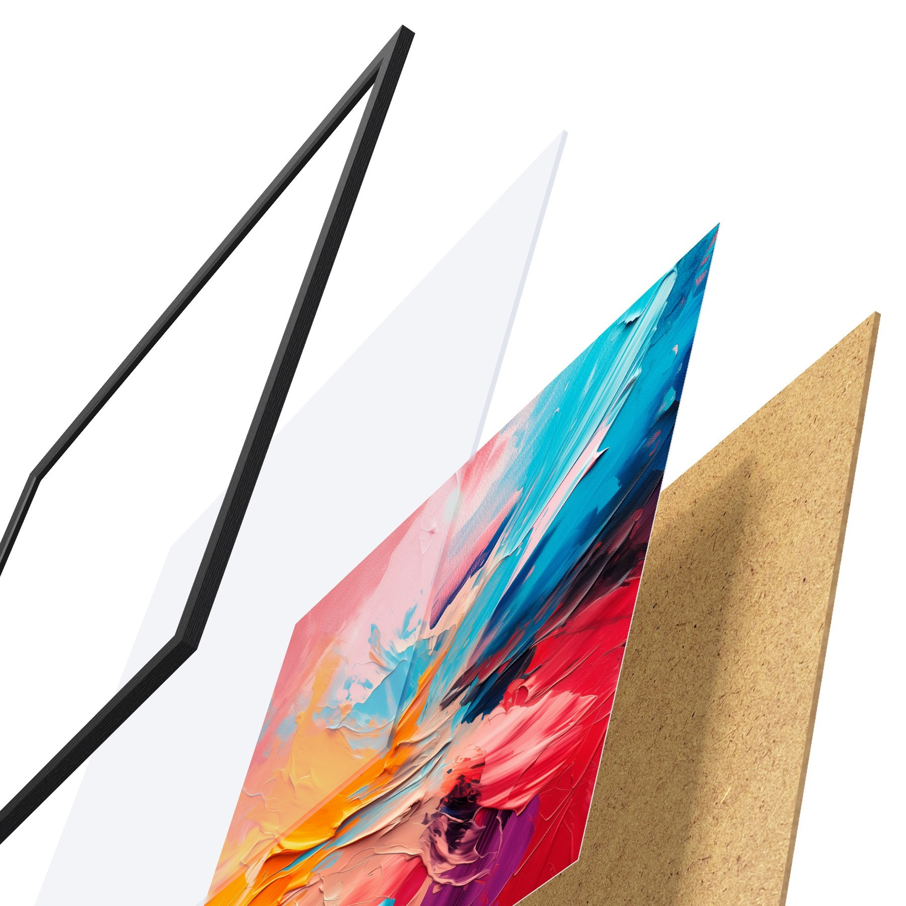 Das Poster besteht aus einem Rahmen, Plexiglas, einem gedruckten Bild und einer Rückwand aus Spanplatten. Dank der Halterungen auf der Rückseite kann das Poster sofort an die Wand gehängt werden.