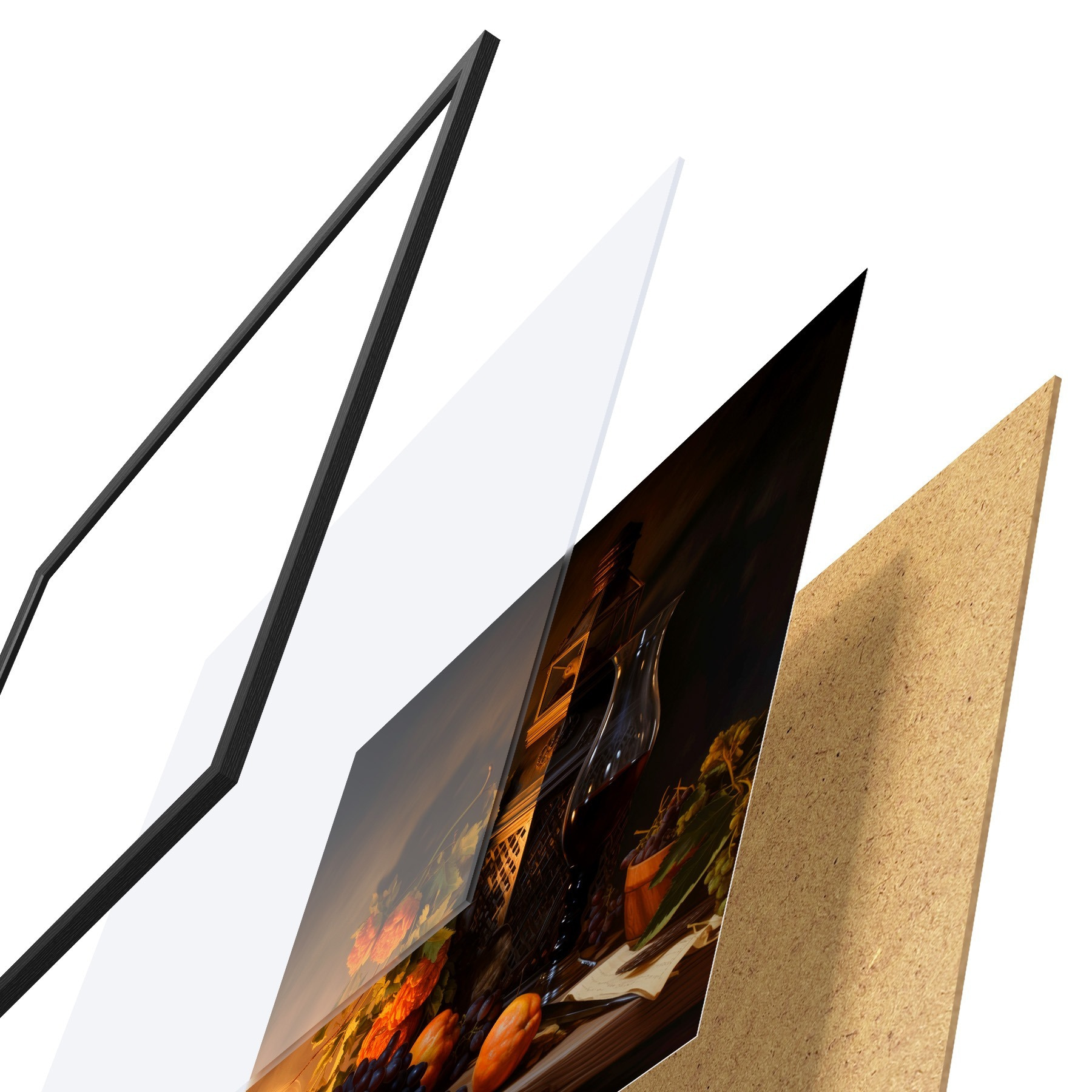 Das Poster besteht aus einem Rahmen, Plexiglas, einem gedruckten Bild und einer Rückwand aus Spanplatten. Dank der Halterungen auf der Rückseite kann das Poster sofort an die Wand gehängt werden.