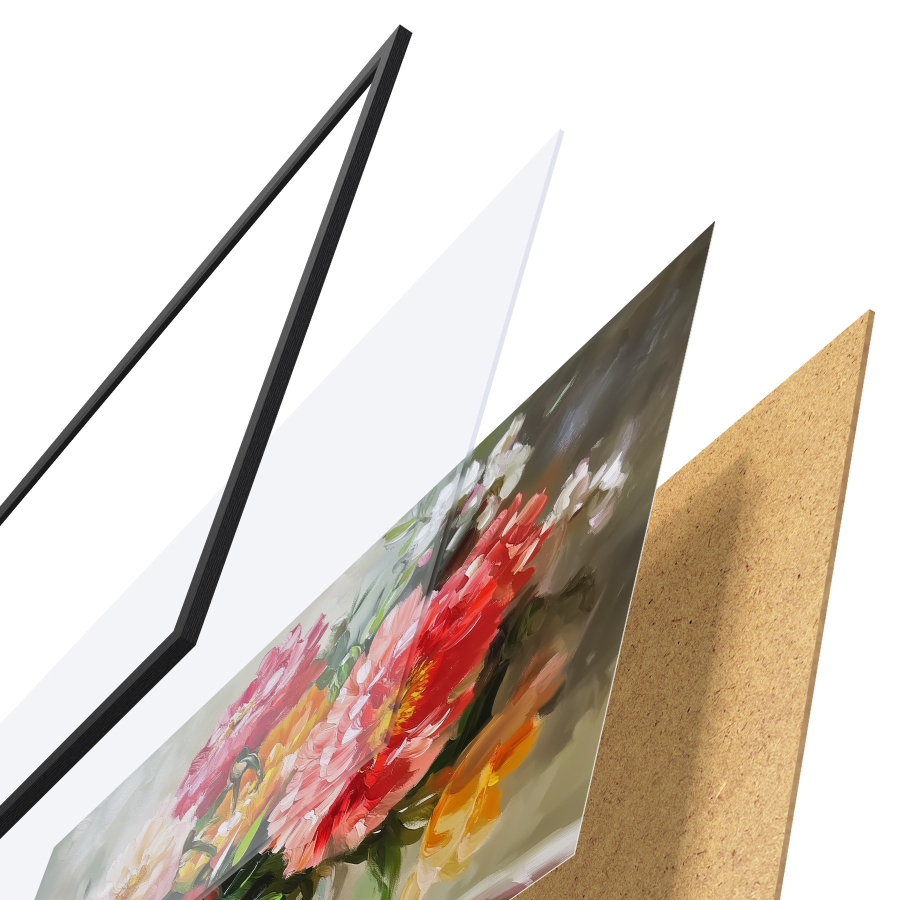 Das Poster besteht aus einem Rahmen, Plexiglas, einem gedruckten Bild und einer Rückwand aus Spanplatten. Dank der Halterungen auf der Rückseite kann das Poster sofort an die Wand gehängt werden.