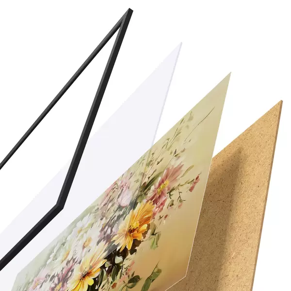 Das Poster besteht aus einem Rahmen, Plexiglas, einem gedruckten Bild und einer Rückwand aus Spanplatten. Dank der Halterungen auf der Rückseite kann das Poster sofort an die Wand gehängt werden.