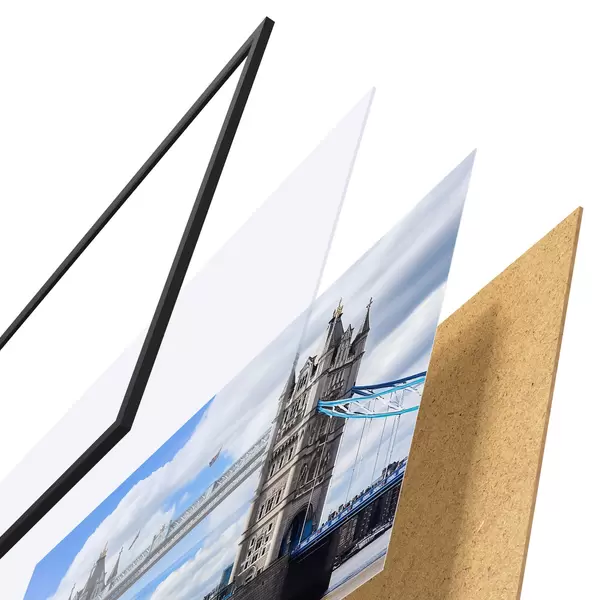 Das Poster besteht aus einem Rahmen, Plexiglas, einem gedruckten Bild und einer Rückwand aus Spanplatten. Dank der Halterungen auf der Rückseite kann das Poster sofort an die Wand gehängt werden.