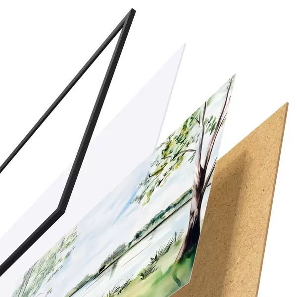 Das Poster besteht aus einem Rahmen, Plexiglas, einem gedruckten Bild und einer Rückwand aus Spanplatten. Dank der Halterungen auf der Rückseite kann das Poster sofort an die Wand gehängt werden.