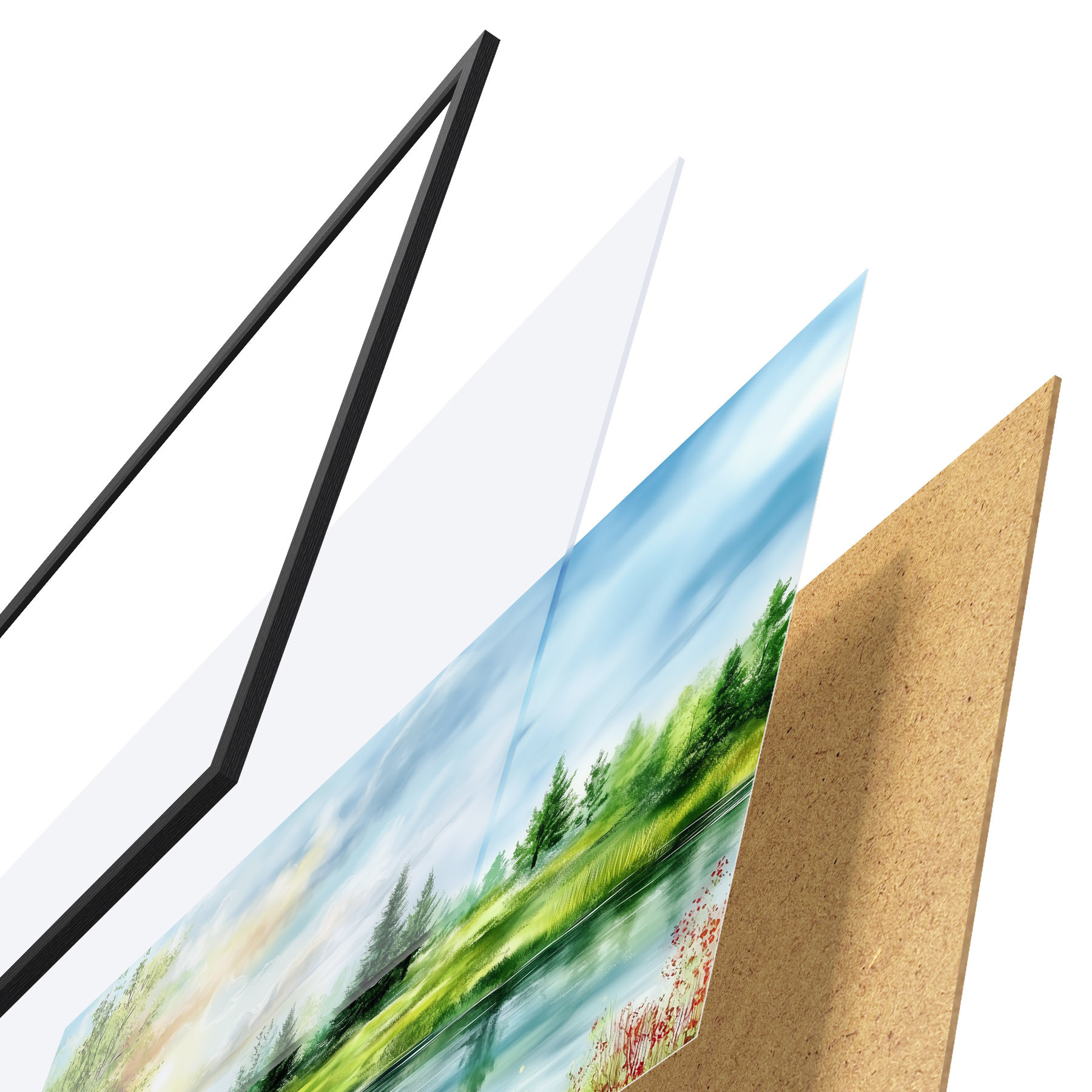 Das Poster besteht aus einem Rahmen, Plexiglas, einem gedruckten Bild und einer Rückwand aus Spanplatten. Dank der Halterungen auf der Rückseite kann das Poster sofort an die Wand gehängt werden.