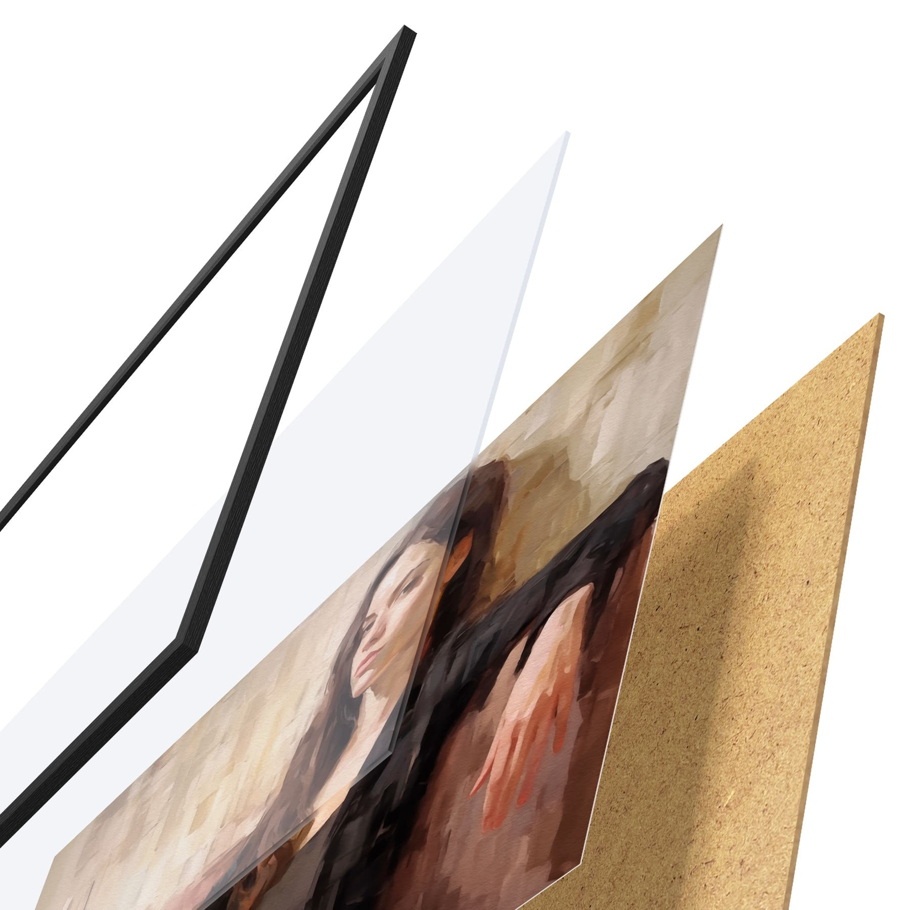 Das Poster besteht aus einem Rahmen, Plexiglas, einem gedruckten Bild und einer Rückwand aus Spanplatten. Dank der Halterungen auf der Rückseite kann das Poster sofort an die Wand gehängt werden.