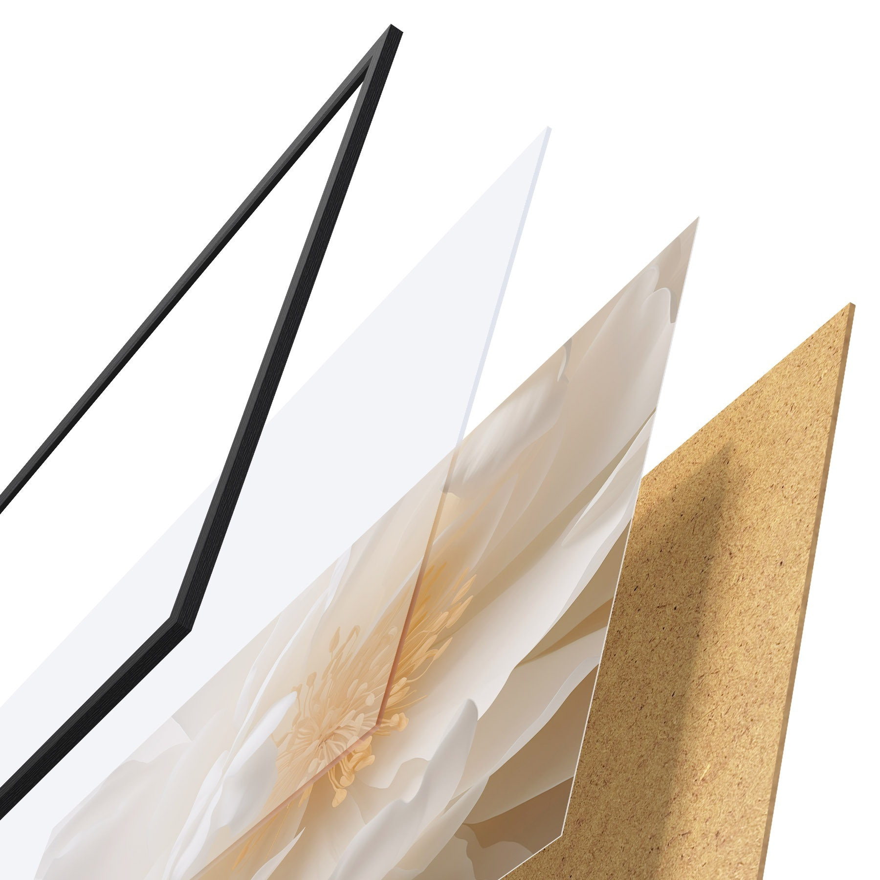 Das Poster besteht aus einem Rahmen, Plexiglas, einem gedruckten Bild und einer Rückwand aus Spanplatten. Dank der Halterungen auf der Rückseite kann das Poster sofort an die Wand gehängt werden.