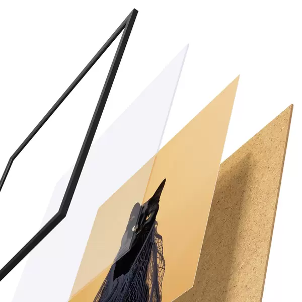 Das Poster besteht aus einem Rahmen, Plexiglas, einem gedruckten Bild und einer Rückwand aus Spanplatten. Dank der Halterungen auf der Rückseite kann das Poster sofort an die Wand gehängt werden.