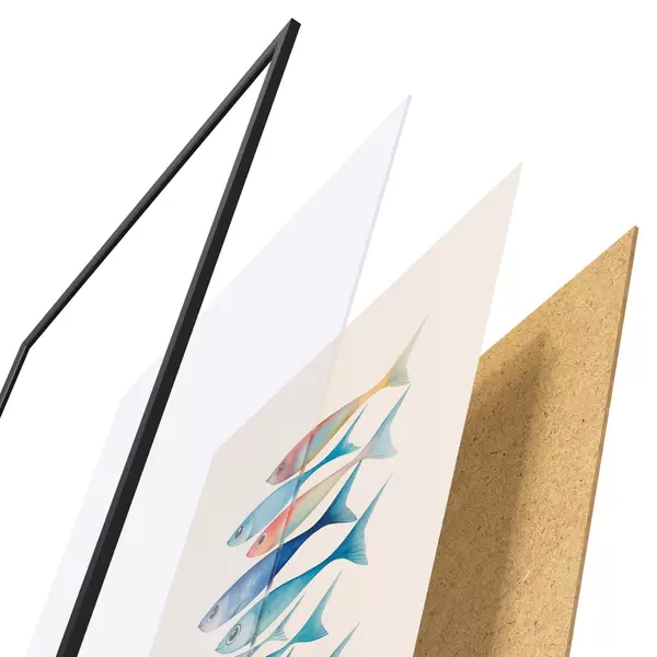 Das Poster besteht aus einem Rahmen, Plexiglas, einem gedruckten Bild und einer Rückwand aus Spanplatten. Dank der Halterungen auf der Rückseite kann das Poster sofort an die Wand gehängt werden.
