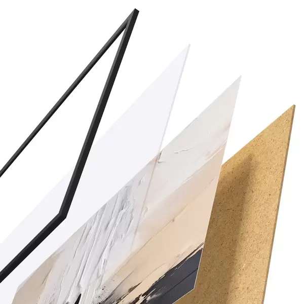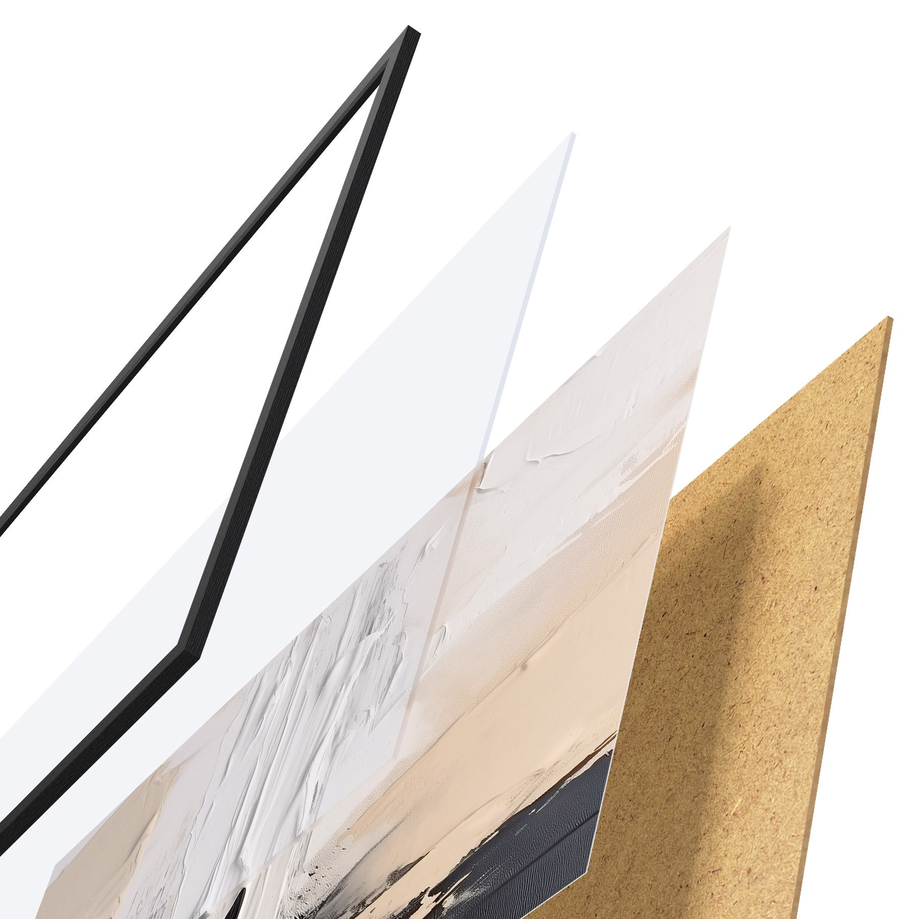 Das Poster besteht aus einem Rahmen, Plexiglas, einem gedruckten Bild und einer Rückwand aus Spanplatten. Dank der Halterungen auf der Rückseite kann das Poster sofort an die Wand gehängt werden.
