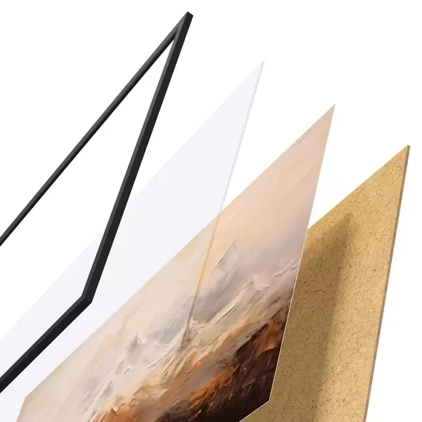 Das Poster besteht aus einem Rahmen, Plexiglas, einem gedruckten Bild und einer Rückwand aus Spanplatten. Dank der Halterungen auf der Rückseite kann das Poster sofort an die Wand gehängt werden.