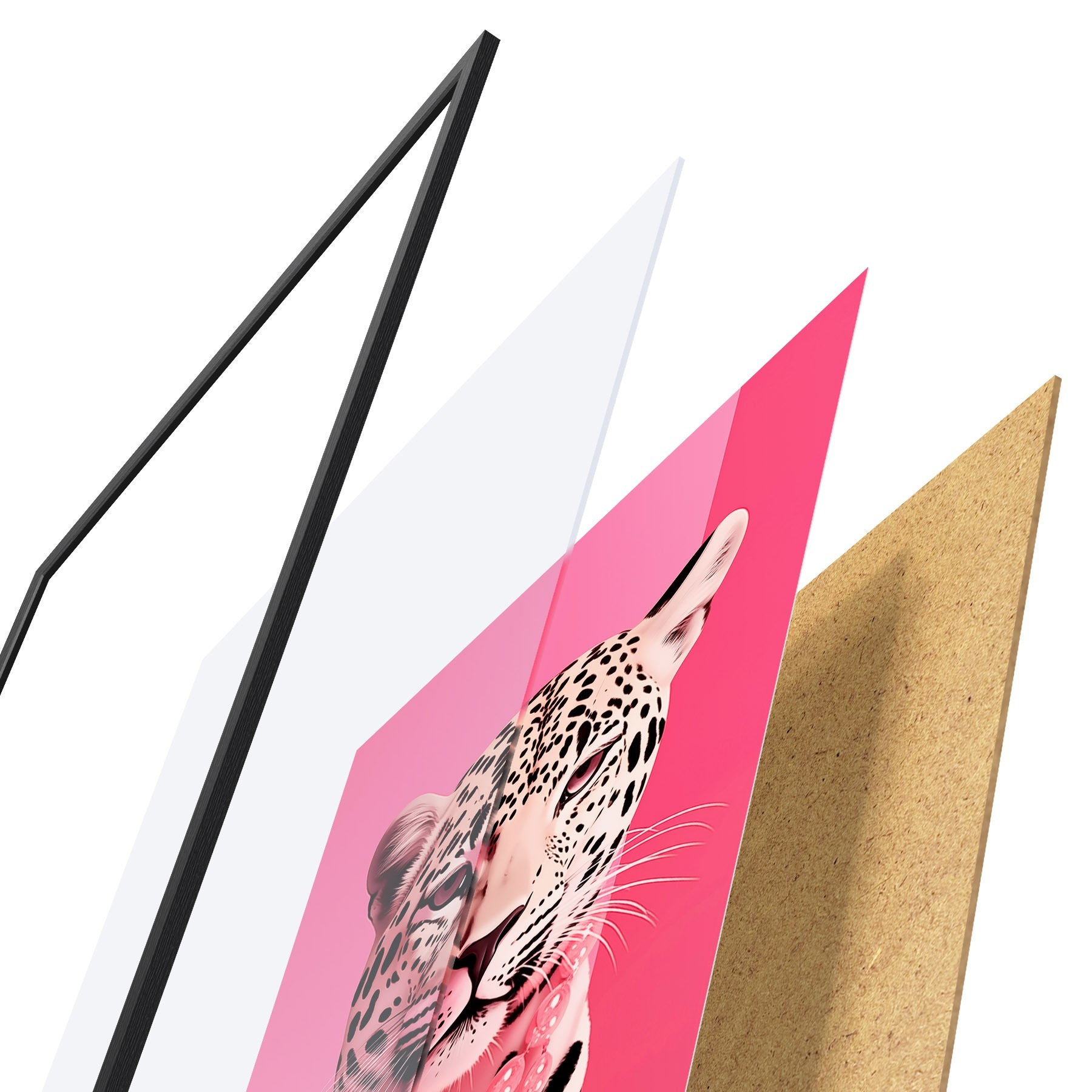 Das Poster besteht aus einem Rahmen, Plexiglas, einem gedruckten Bild und einer Rückwand aus Spanplatten. Dank der Halterungen auf der Rückseite kann das Poster sofort an die Wand gehängt werden.