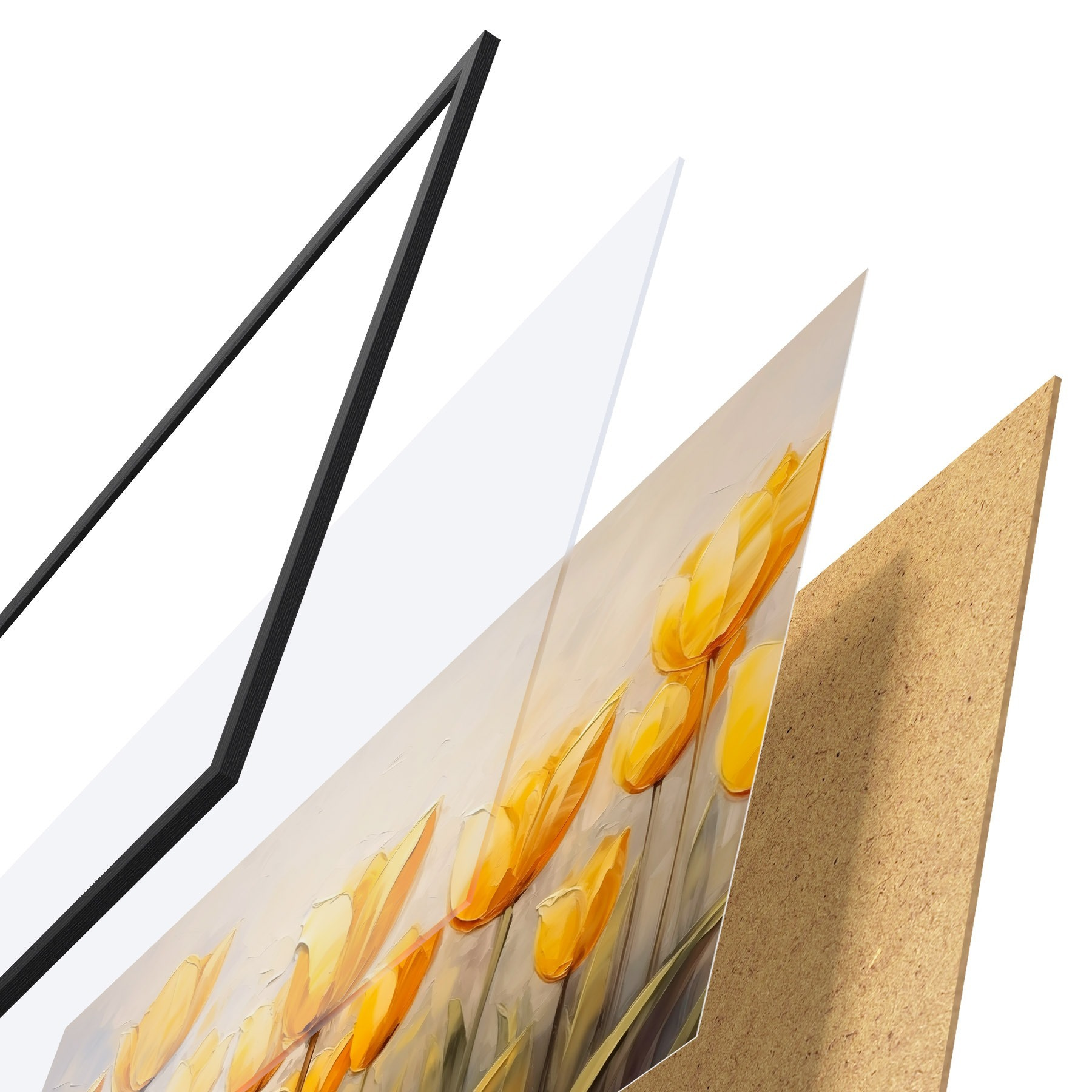 Das Poster besteht aus einem Rahmen, Plexiglas, einem gedruckten Bild und einer Rückwand aus Spanplatten. Dank der Halterungen auf der Rückseite kann das Poster sofort an die Wand gehängt werden.