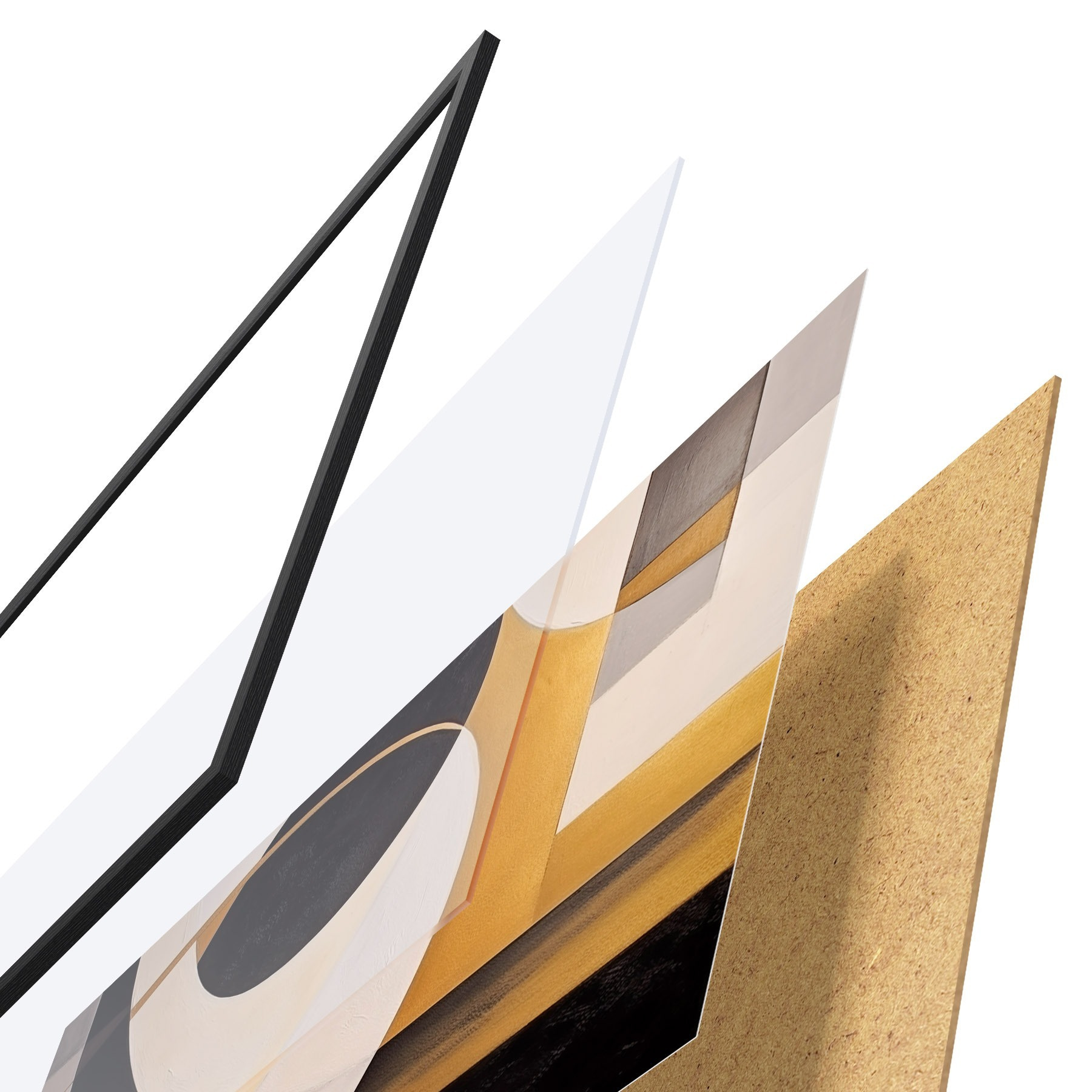 Das Poster besteht aus einem Rahmen, Plexiglas, einem gedruckten Bild und einer Rückwand aus Spanplatten. Dank der Halterungen auf der Rückseite kann das Poster sofort an die Wand gehängt werden.