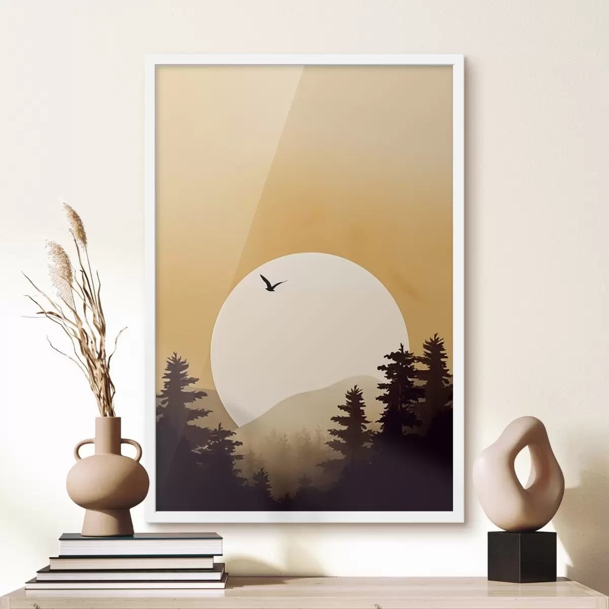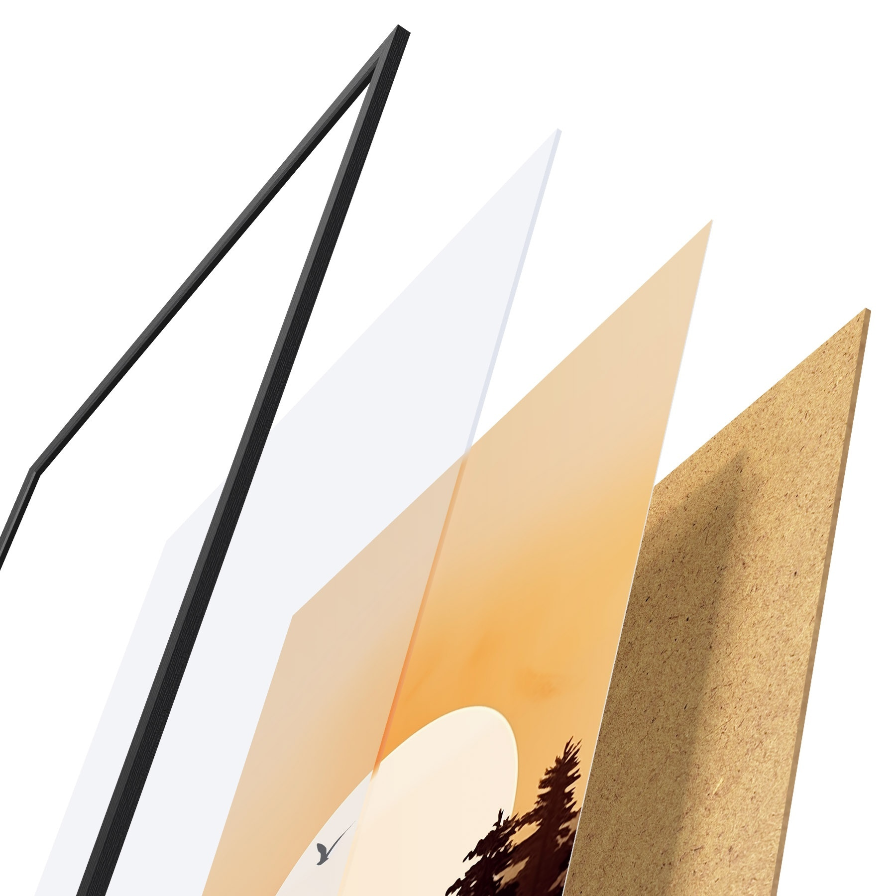 Das Poster besteht aus einem Rahmen, Plexiglas, einem gedruckten Bild und einer Rückwand aus Spanplatten. Dank der Halterungen auf der Rückseite kann das Poster sofort an die Wand gehängt werden.
