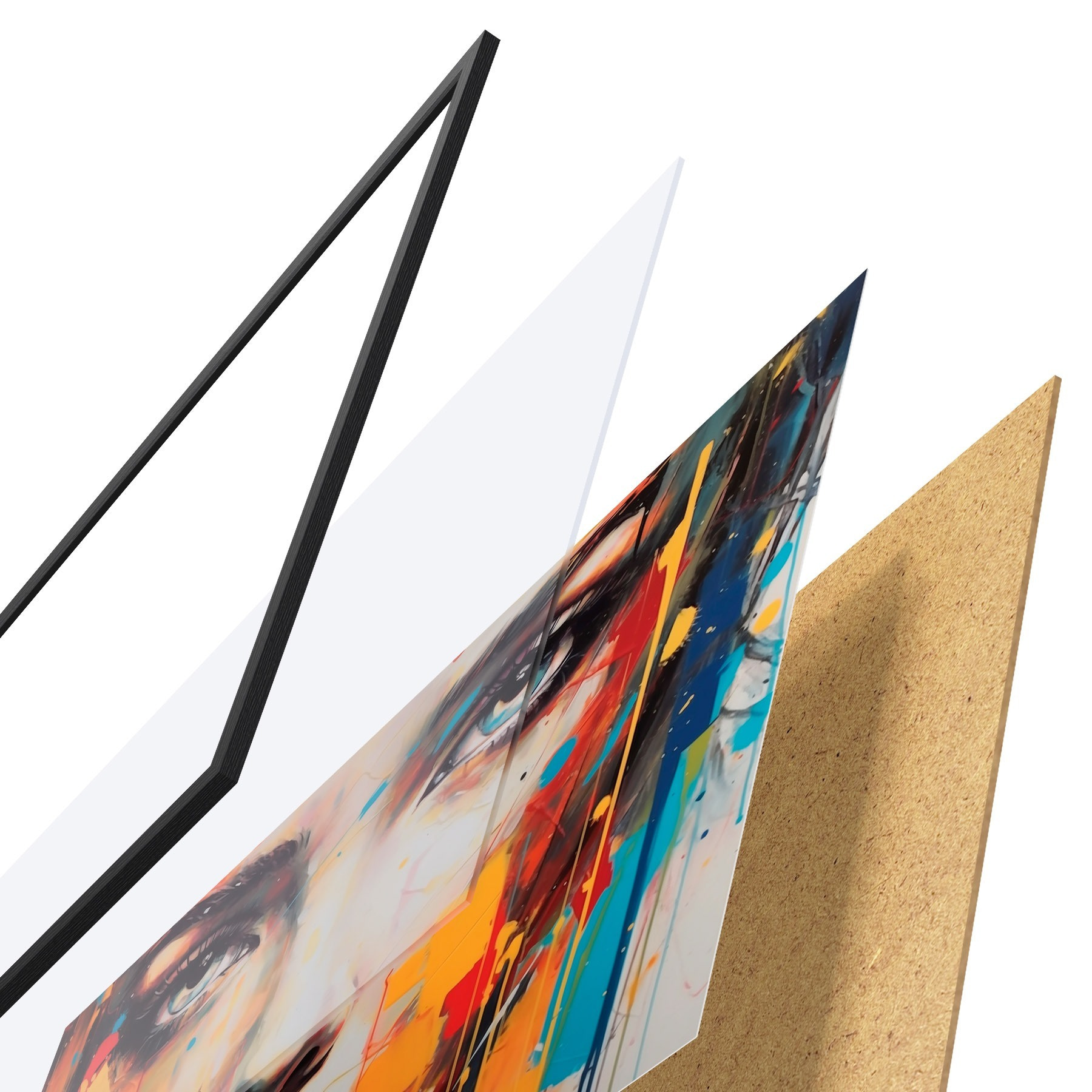 Das Poster besteht aus einem Rahmen, Plexiglas, einem gedruckten Bild und einer Rückwand aus Spanplatten. Dank der Halterungen auf der Rückseite kann das Poster sofort an die Wand gehängt werden.