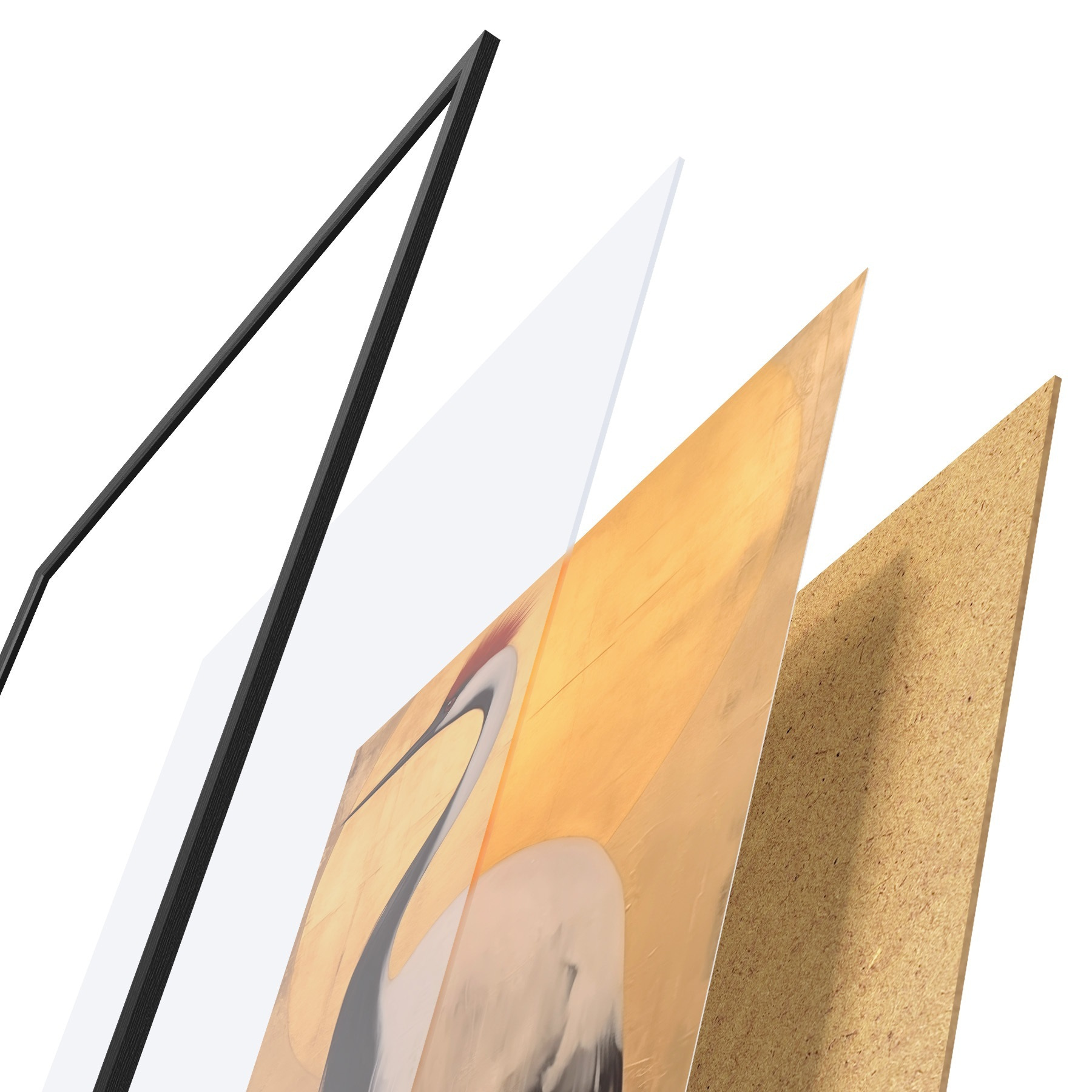 Das Poster besteht aus einem Rahmen, Plexiglas, einem gedruckten Bild und einer Rückwand aus Spanplatten. Dank der Halterungen auf der Rückseite kann das Poster sofort an die Wand gehängt werden.