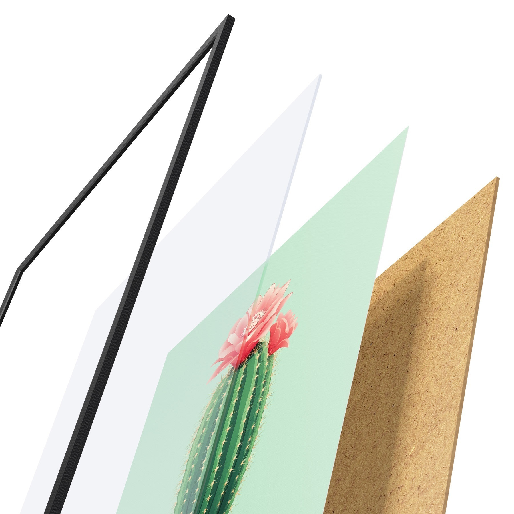 Das Poster besteht aus einem Rahmen, Plexiglas, einem gedruckten Bild und einer Rückwand aus Spanplatten. Dank der Halterungen auf der Rückseite kann das Poster sofort an die Wand gehängt werden.