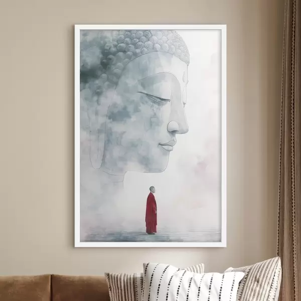 Poster Buddhistischer Mönch in roter Robe, Buddha-Silhouette, Aquarellstil f44006