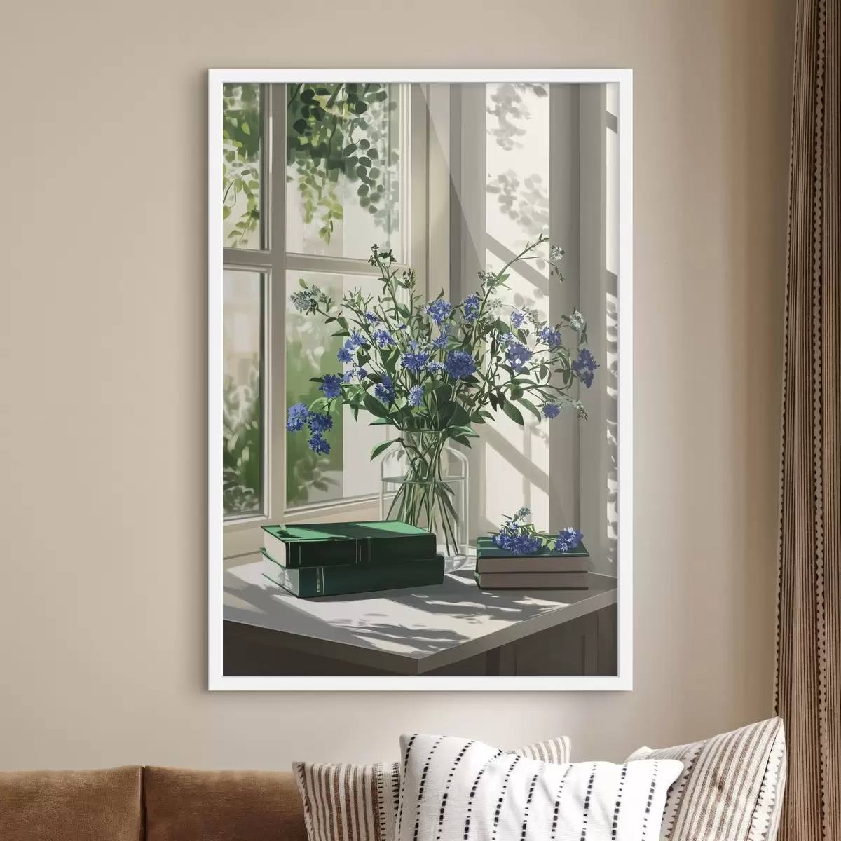 Poster Bücher und lila Blumen in der Vase auf der Fensterbank, Grünzeug Nr f44008