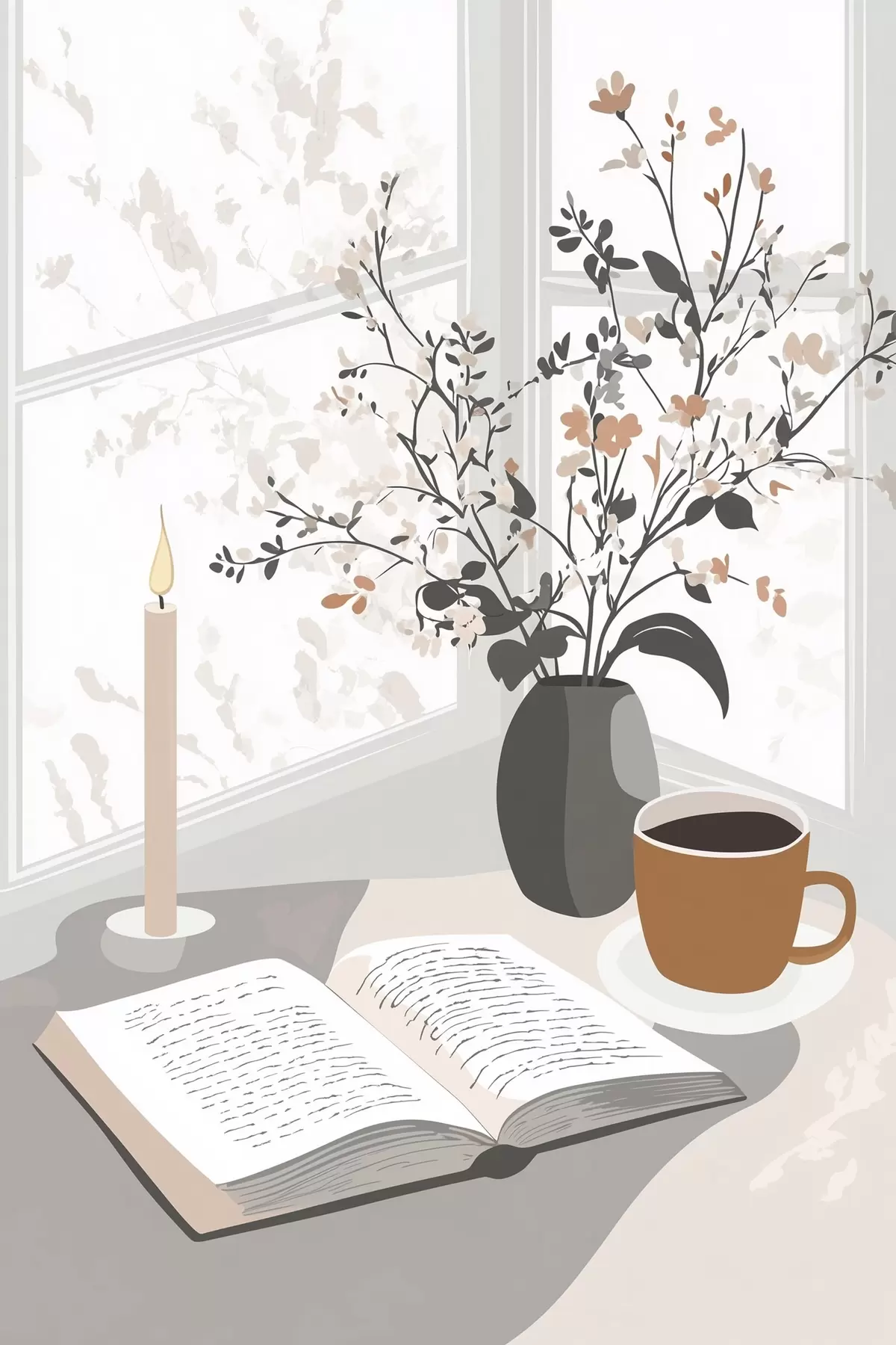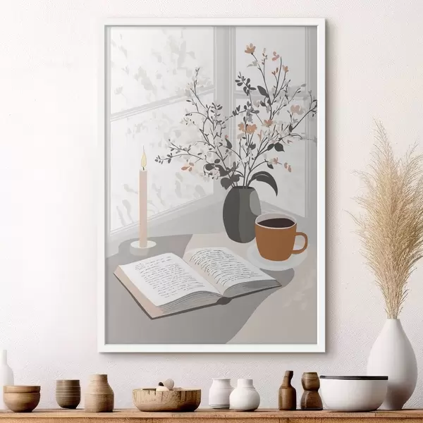 Poster Abstraktion, offenes Buch, Vase mit Blumen, Kerze, beige Farben Nr f44011